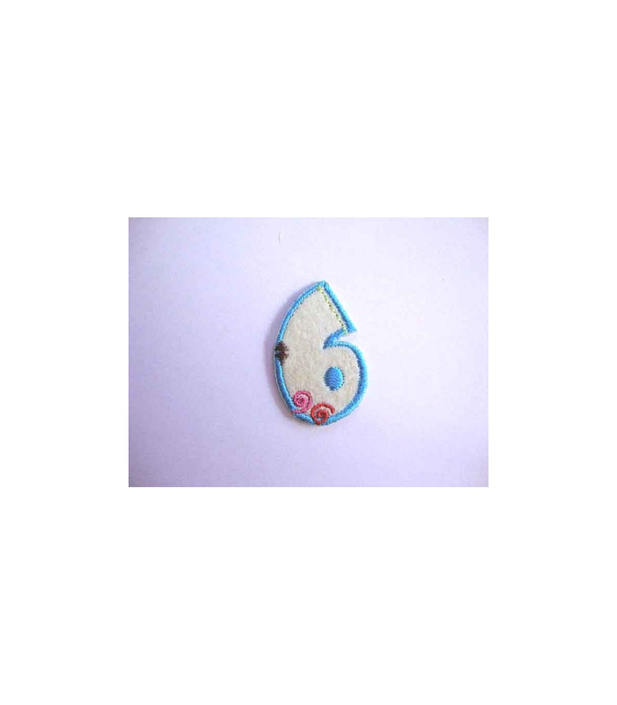 Een opstrijkbare applicatie met een doorsnee van zo'n 3 cm.