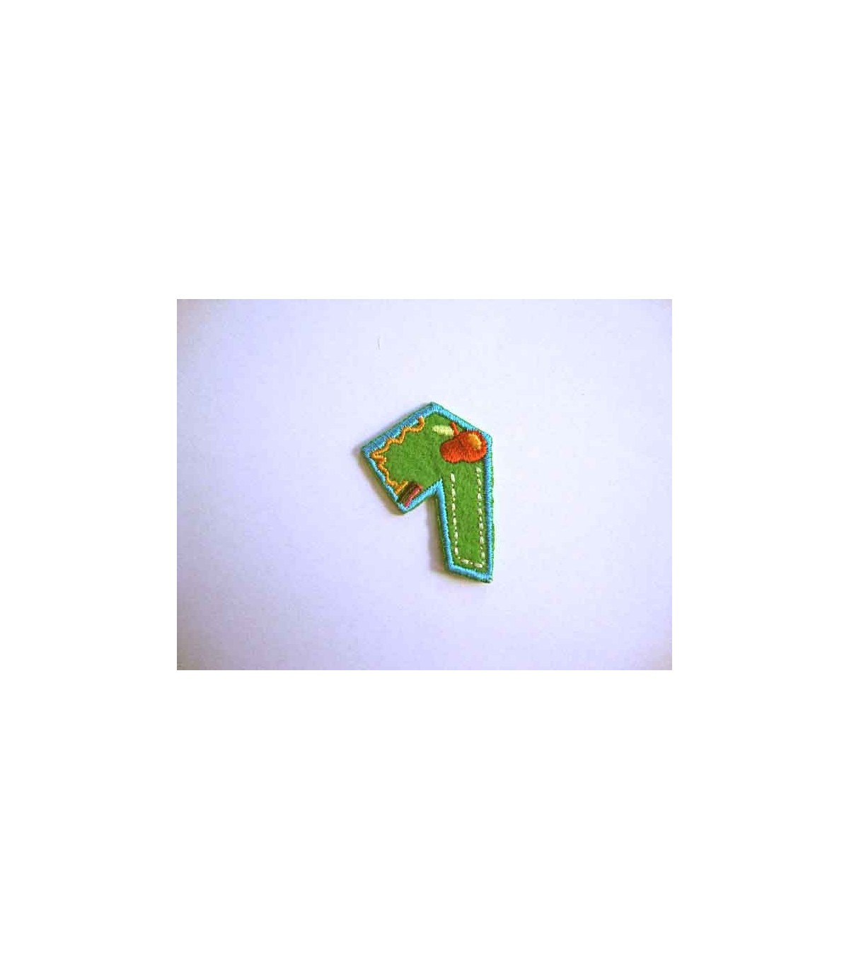 Een opstrijkbare applicatie met een doorsnee van zo'n 3 cm.