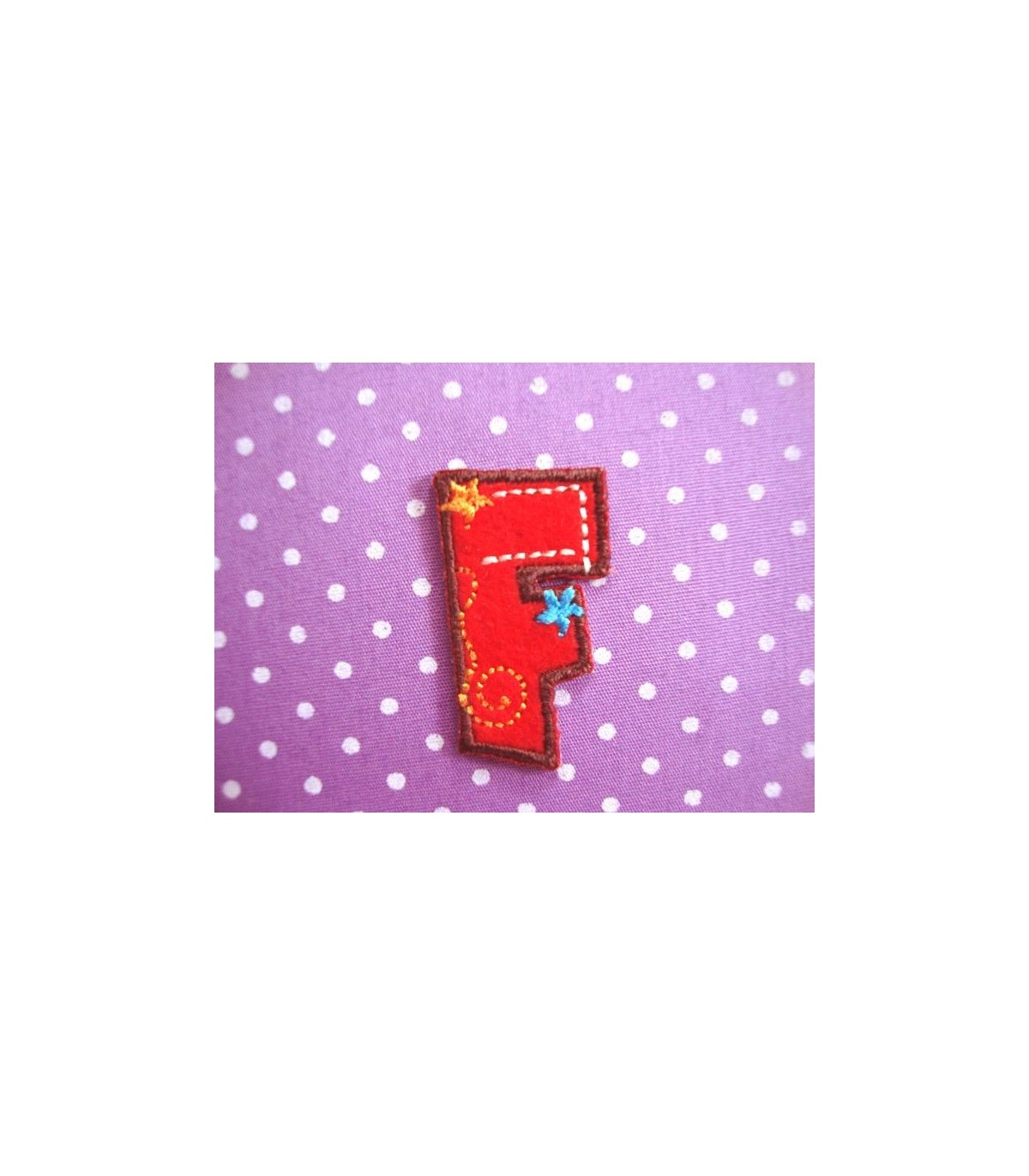 Een opstrijkbare applicatie met een doorsnee van zo'n 3 cm.