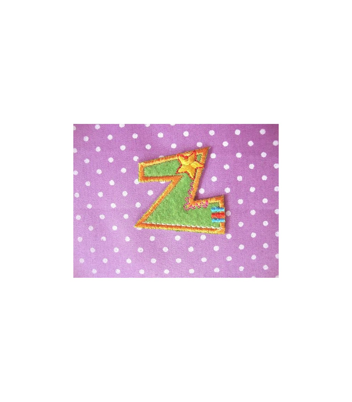 Een opstrijkbare applicatie met een doorsnee van zo'n 3 cm.
