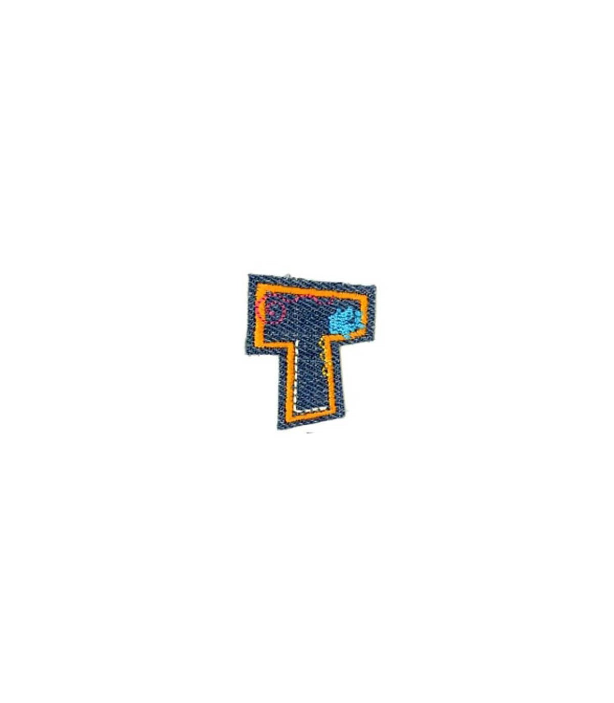 Een opstrijkbare letter T applicatie met een doorsnee van zo'n 3 cm.