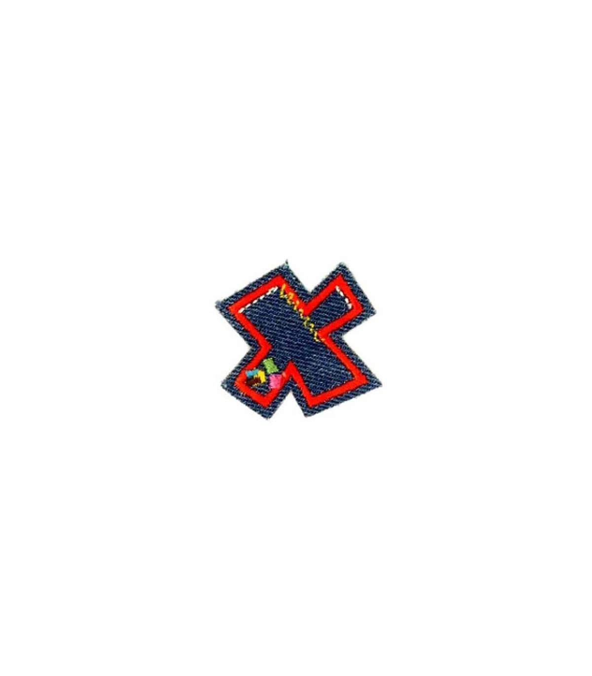 Een opstrijkbare letter X applicatie met een doorsnee van zo'n 3 cm.
