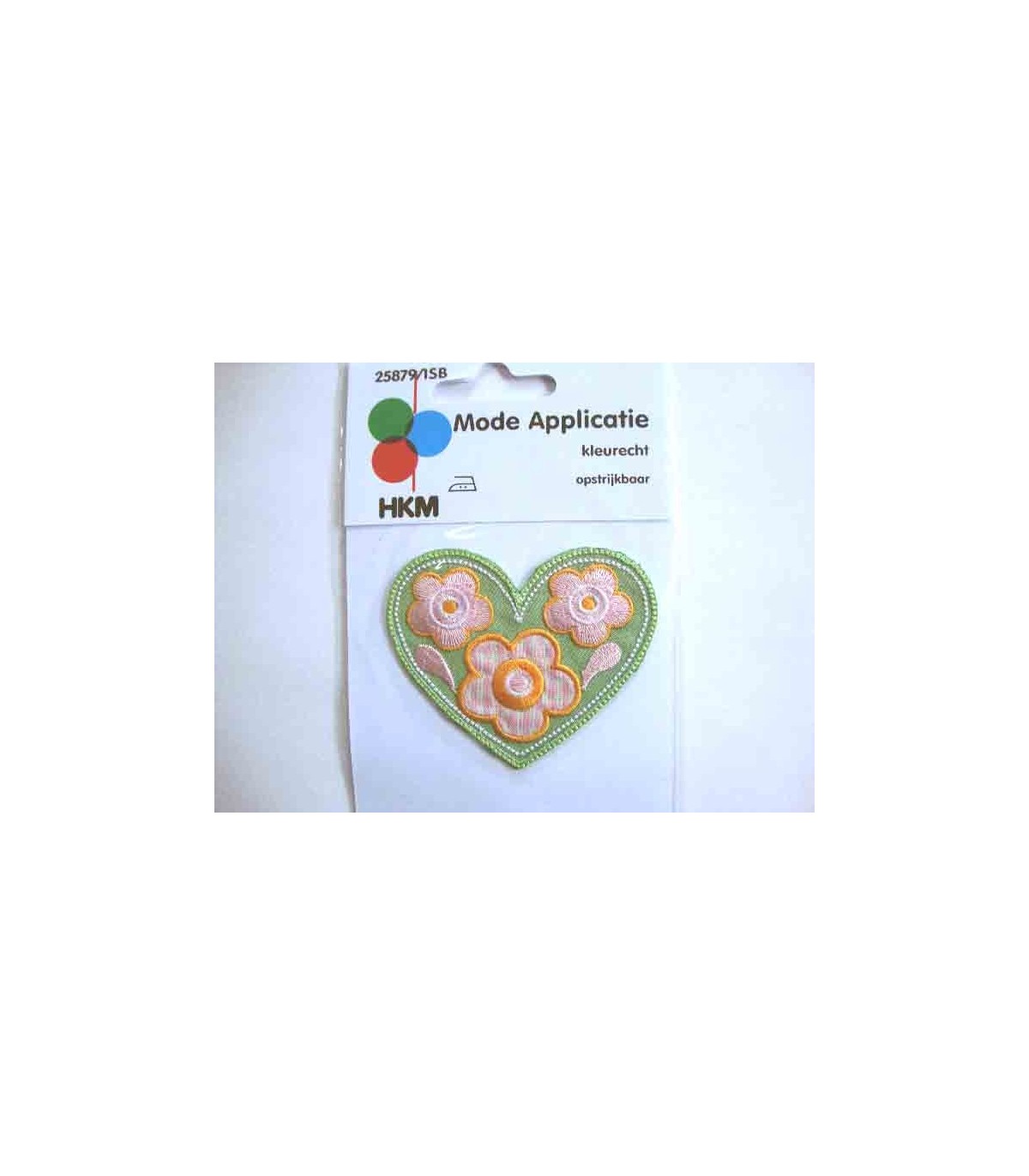 Een opstrijkbare groene hartjes applicatie met drie roze bloemen, waarvan 1 met een roze bb ruit. 7 x 6 cm.
