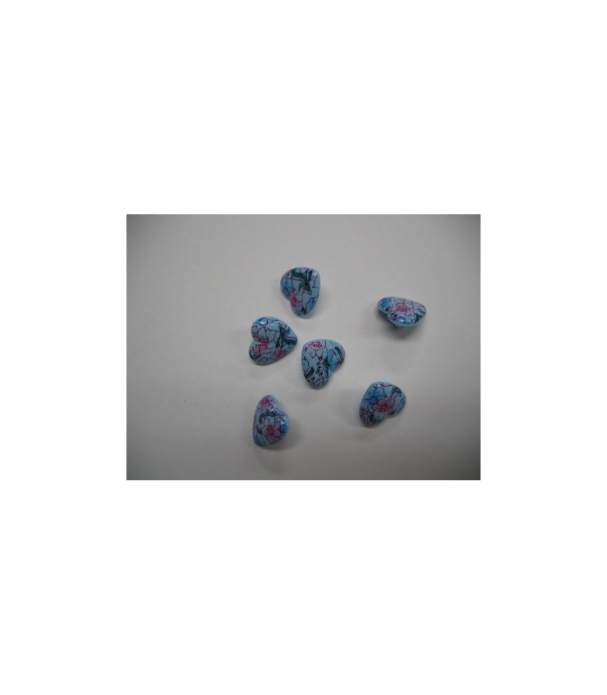 Lichtblauwe kunststof knoop met bloemprint. 15 mm. doorsnee.