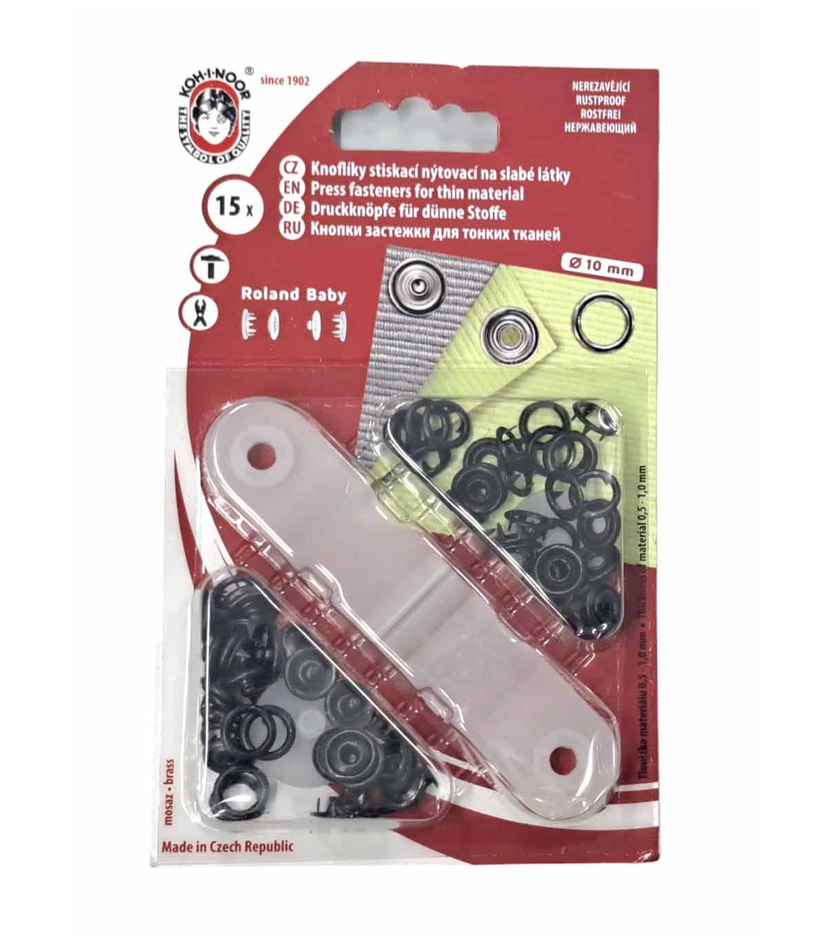 Zwarte inslag baby drukknopen met werktuig. Een open rondje.