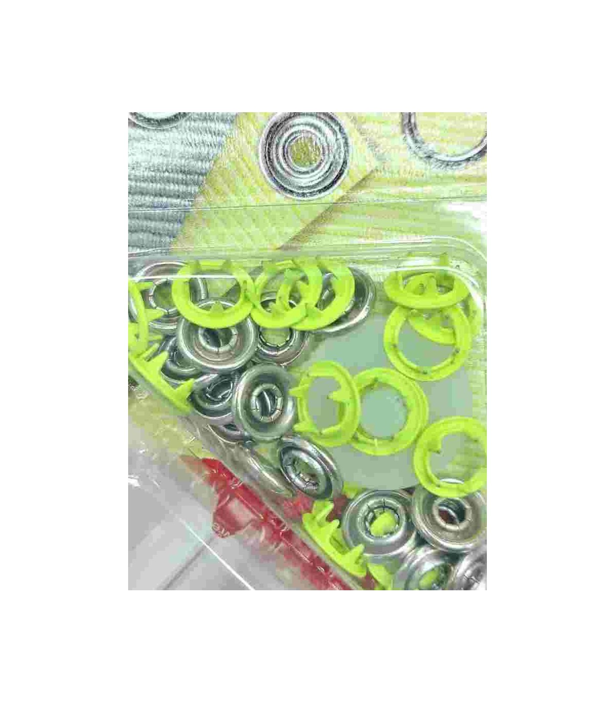 Babydrukkers. Lime kleurige inslag drukknoop met werktuig. Een open rondje.