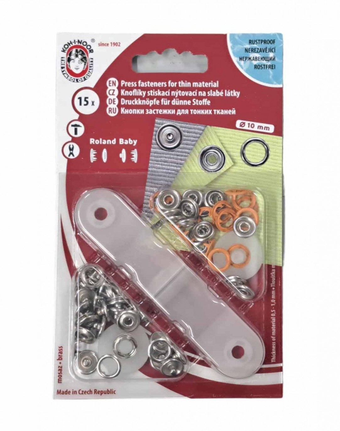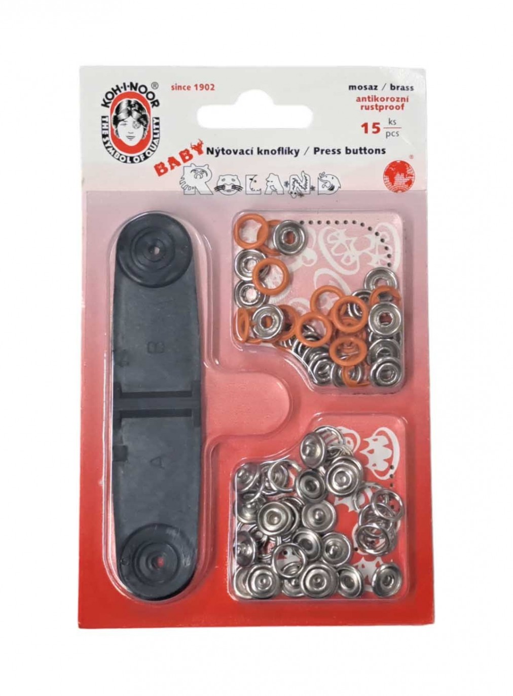 Babydrukkers. Oranje inslag drukknoop met werktuig. Een open rondje.