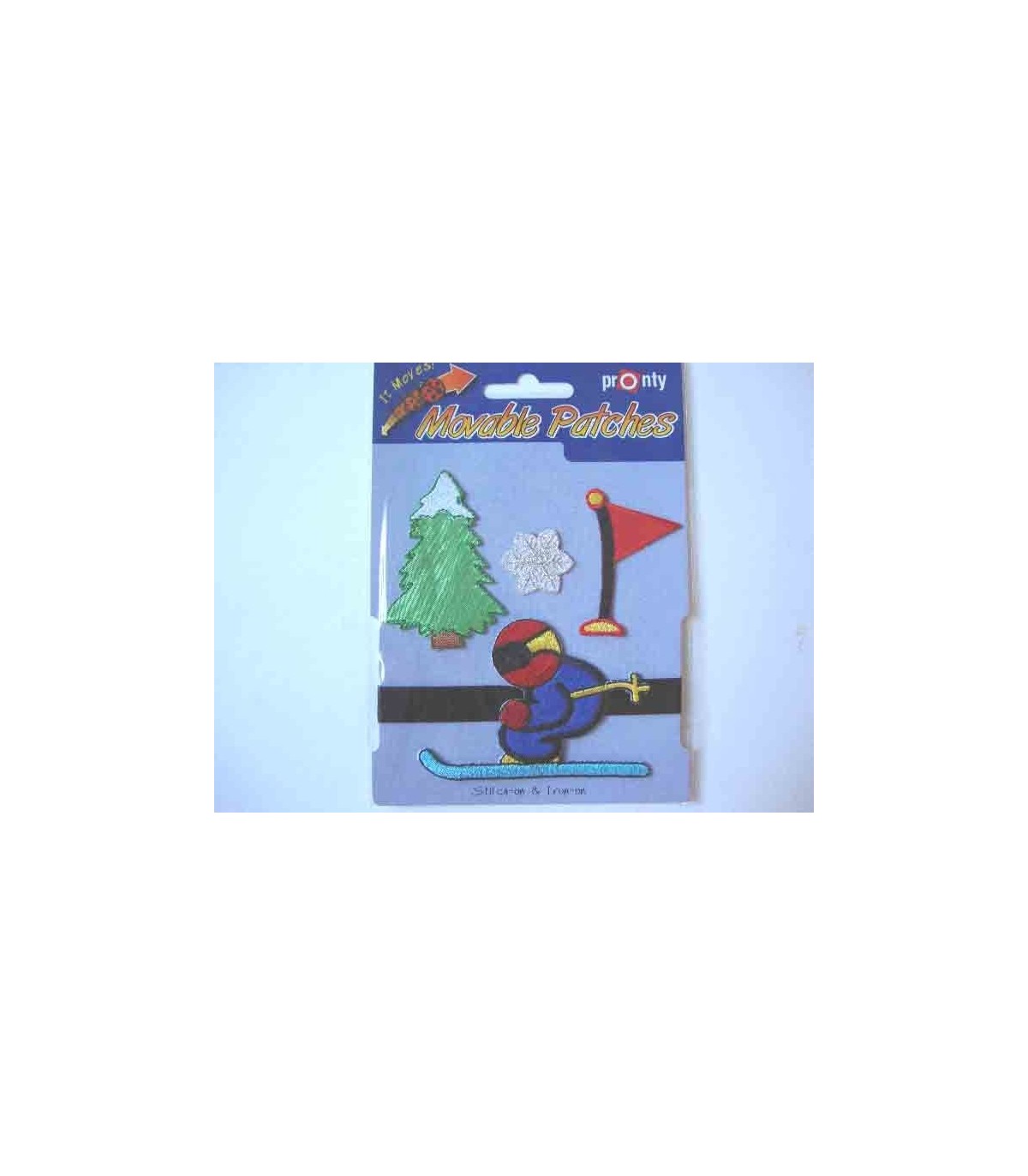 3 Opstrijkbare applicaties. De skieër is schuifbaar en 6 x 8 cm.