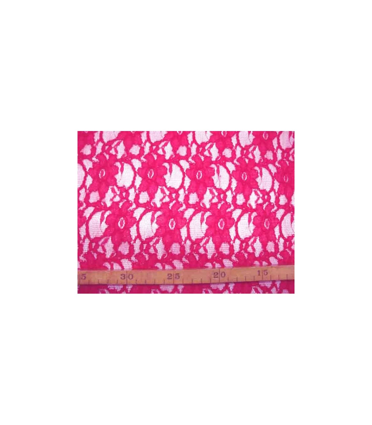 Jacquard kant stof effen rood met bloemenstiksel wat erop ligt.