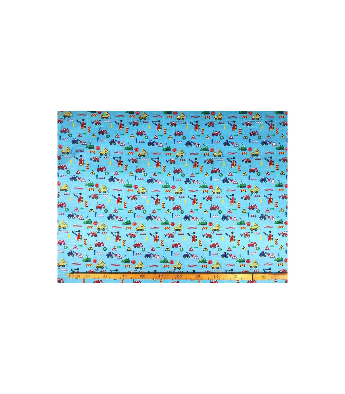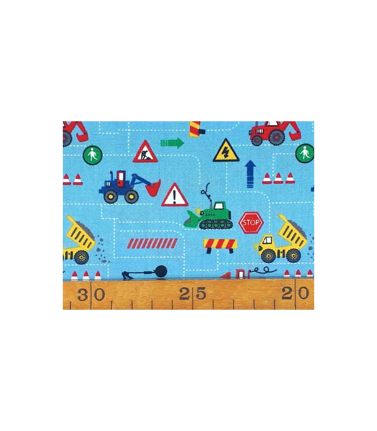 Een bleu kleurige poplin jongensstof met verkeersborden en werk machines in het klein.