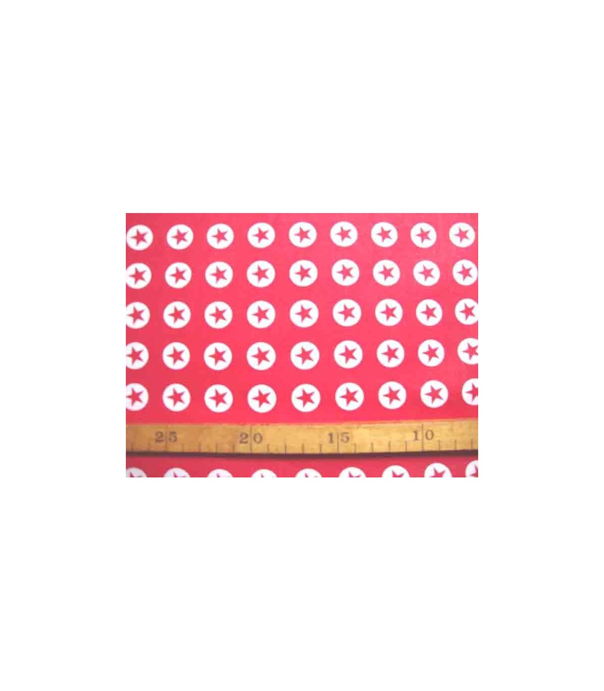 Rode katoen met witte cirkels en sterren. De doorsnee cirkel is 18 mm.
