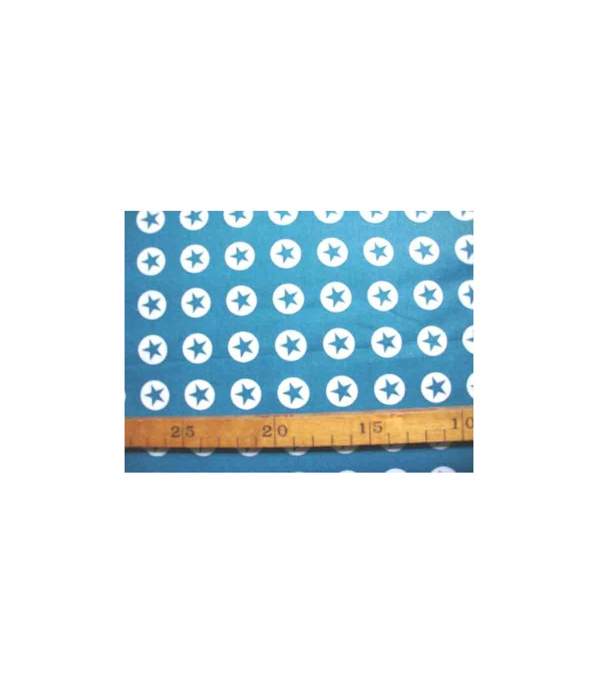 Petrol kleurige katoen met witte cirkels en sterren. De doorsnee cirkel is 18 mm.