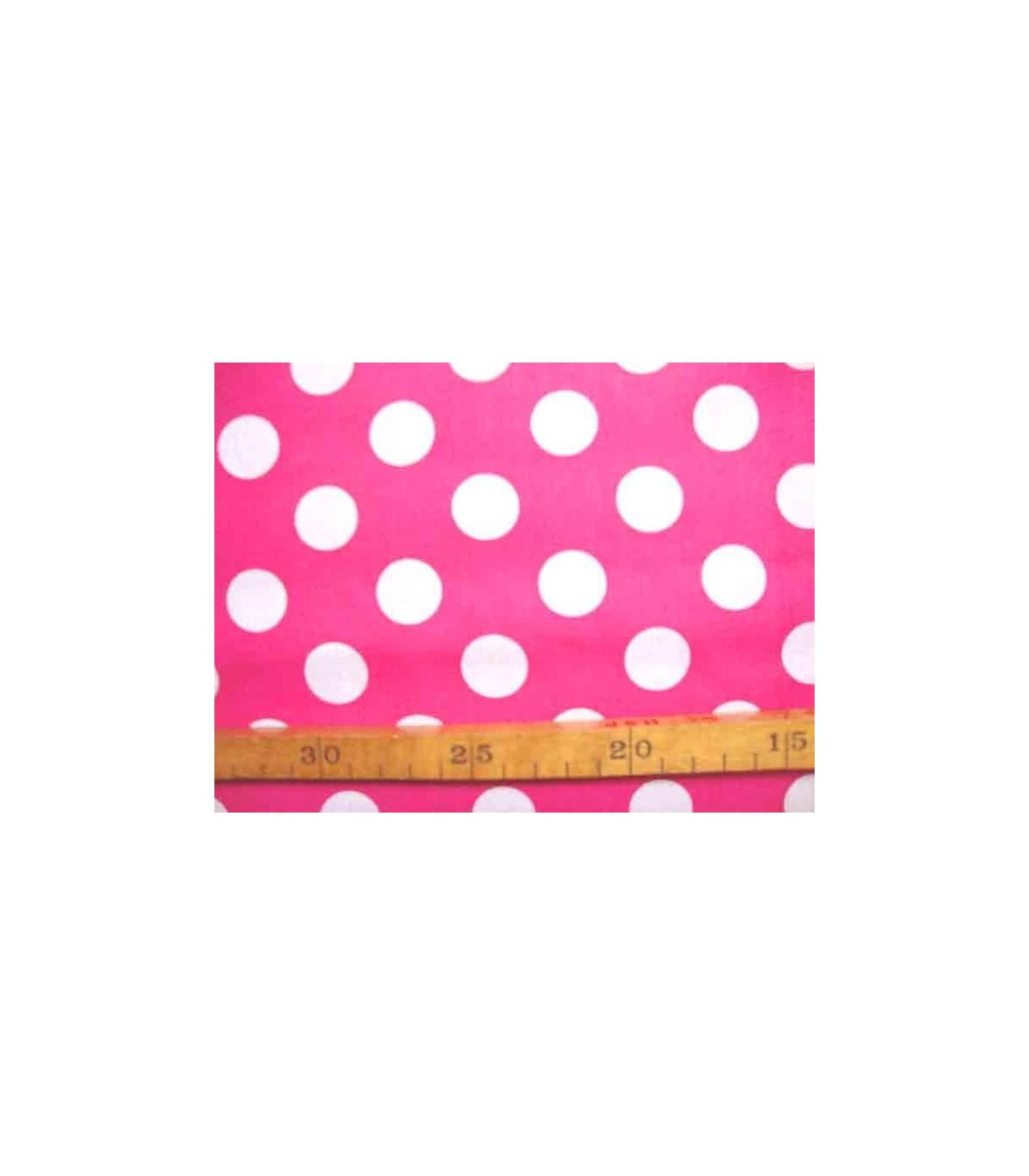 Pink kleurige katoen met grote witte stippen. Doorsnee stip is 22 mm.