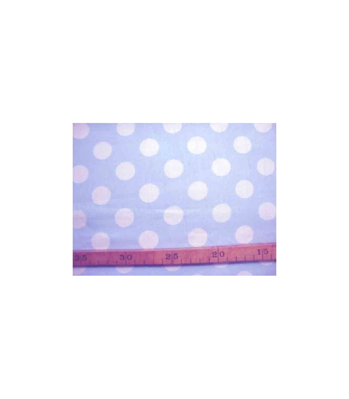 Lichtblauwe katoen met grote witte stippen. Doorsnee stip is 22 mm.