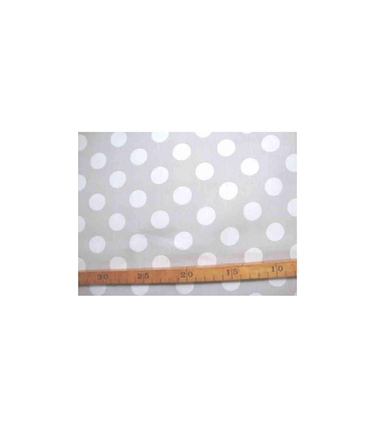 Lichhtgrijze katoen met grote witte stippen. Doorsnee stip is 22 mm.
