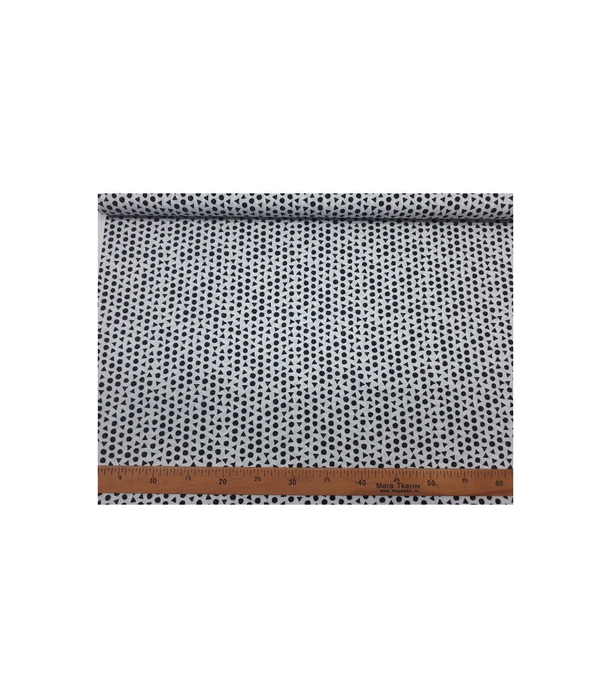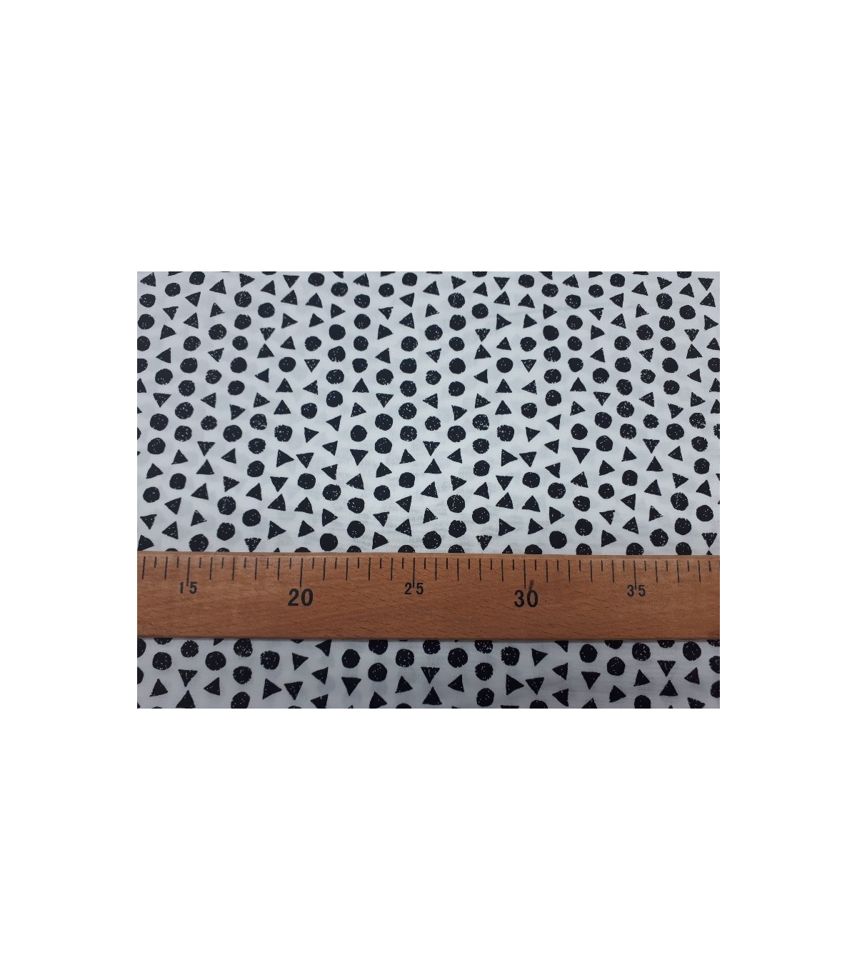 Een witte poplin katoen met zwarte kleine driehoekjes en cirkels.