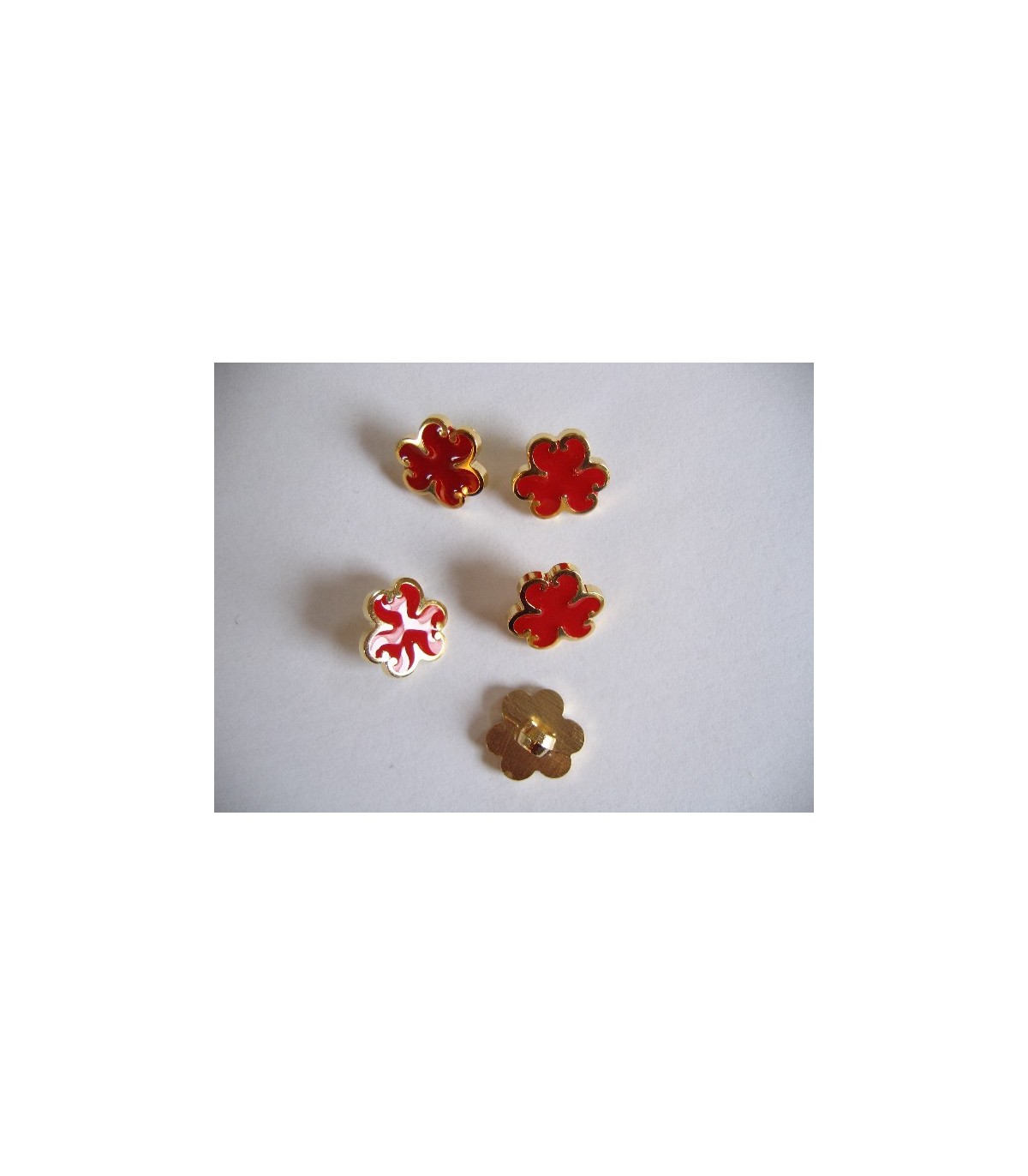 Goudkleurige kunststof bloemknoop met rode blaadjes.