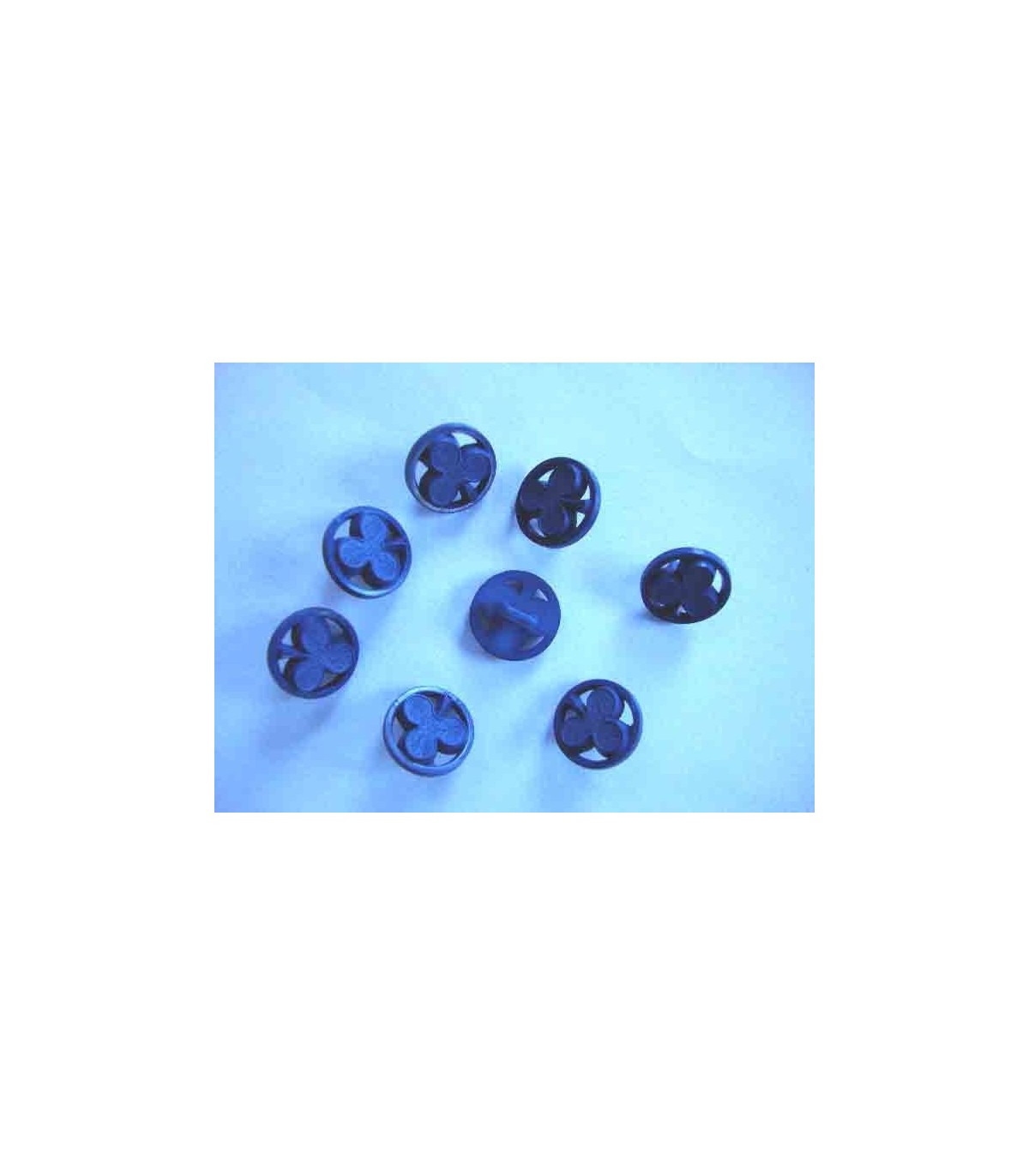 Een kobalt kleurige kunststof knoop met een klaver afbeelding. Doorsnee 13 mm.