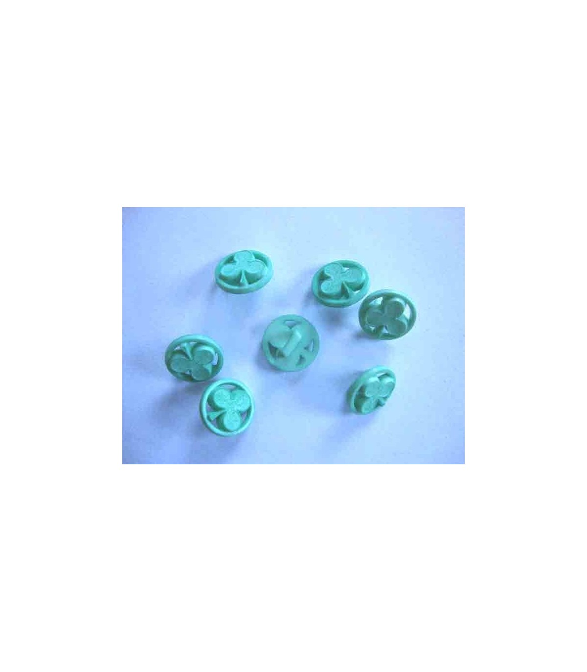 Een mint kleurige kunststof knoop met een klaver afbeelding. Doorsnee 13 mm.