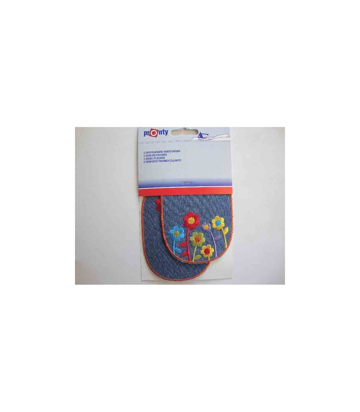 2 opstrijkbare licht jeanskleurige kniestukken met 2 verschillende print van bloemen en een vlinder.