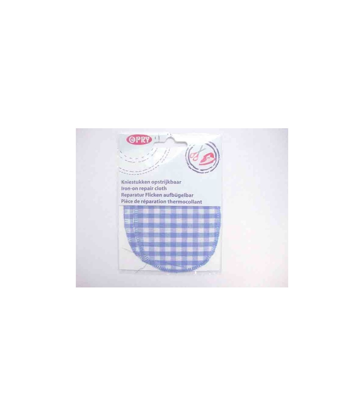 2 opstrijkbare kniestukken met een blauwe boerenbont print. 9 x 12 cm.