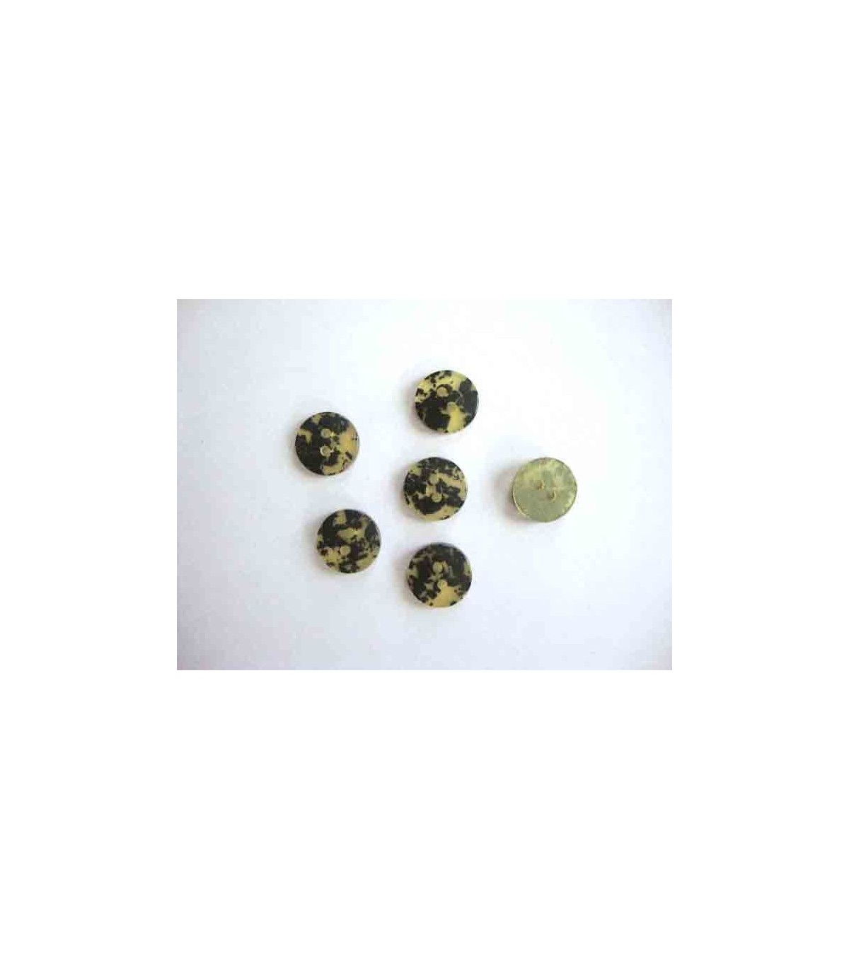 Een Zachtgroene kunststof knoop met zwarte vlekken.
