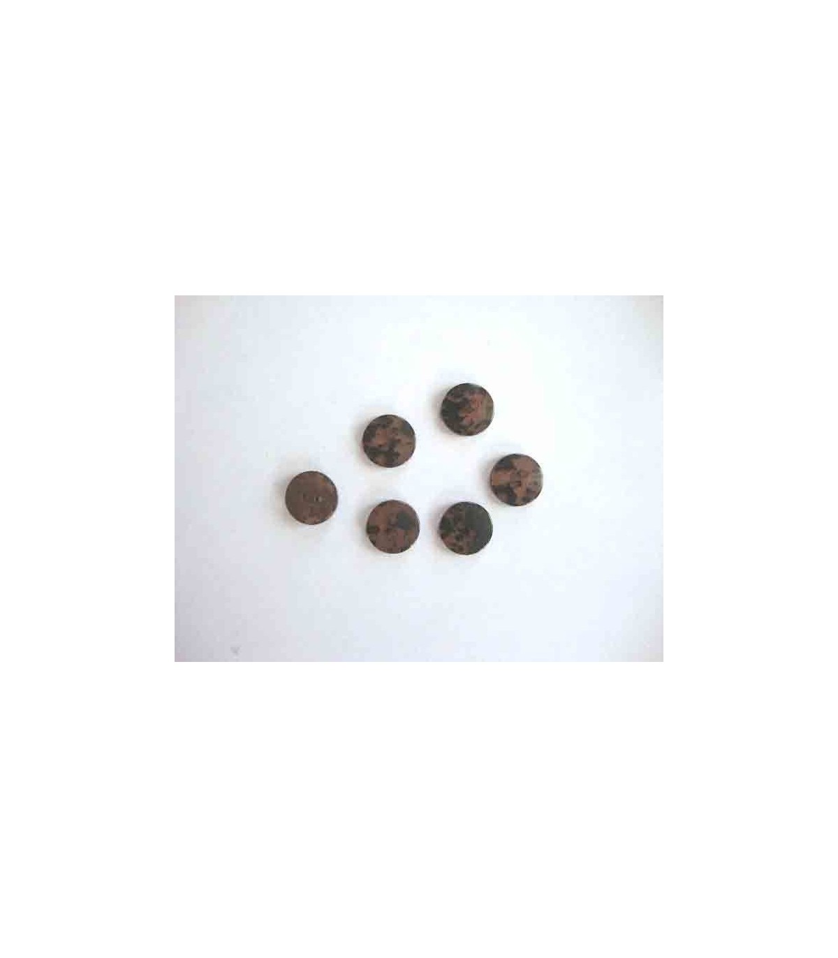 Een Bruine kunststof knoop met zwarte vlekken.