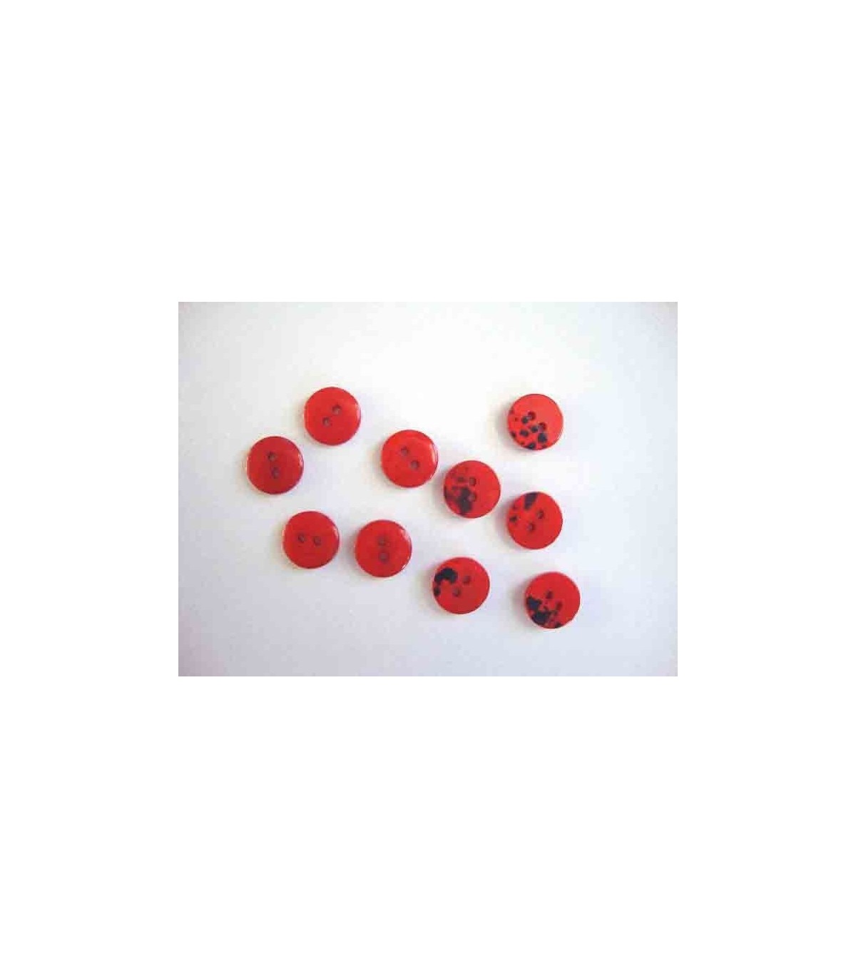 Een kunststof knoop rood met een doorsnee van 12 mm. Kan aan beide kanten worden verwerkt. 1 kant effen de andere gevlekt.