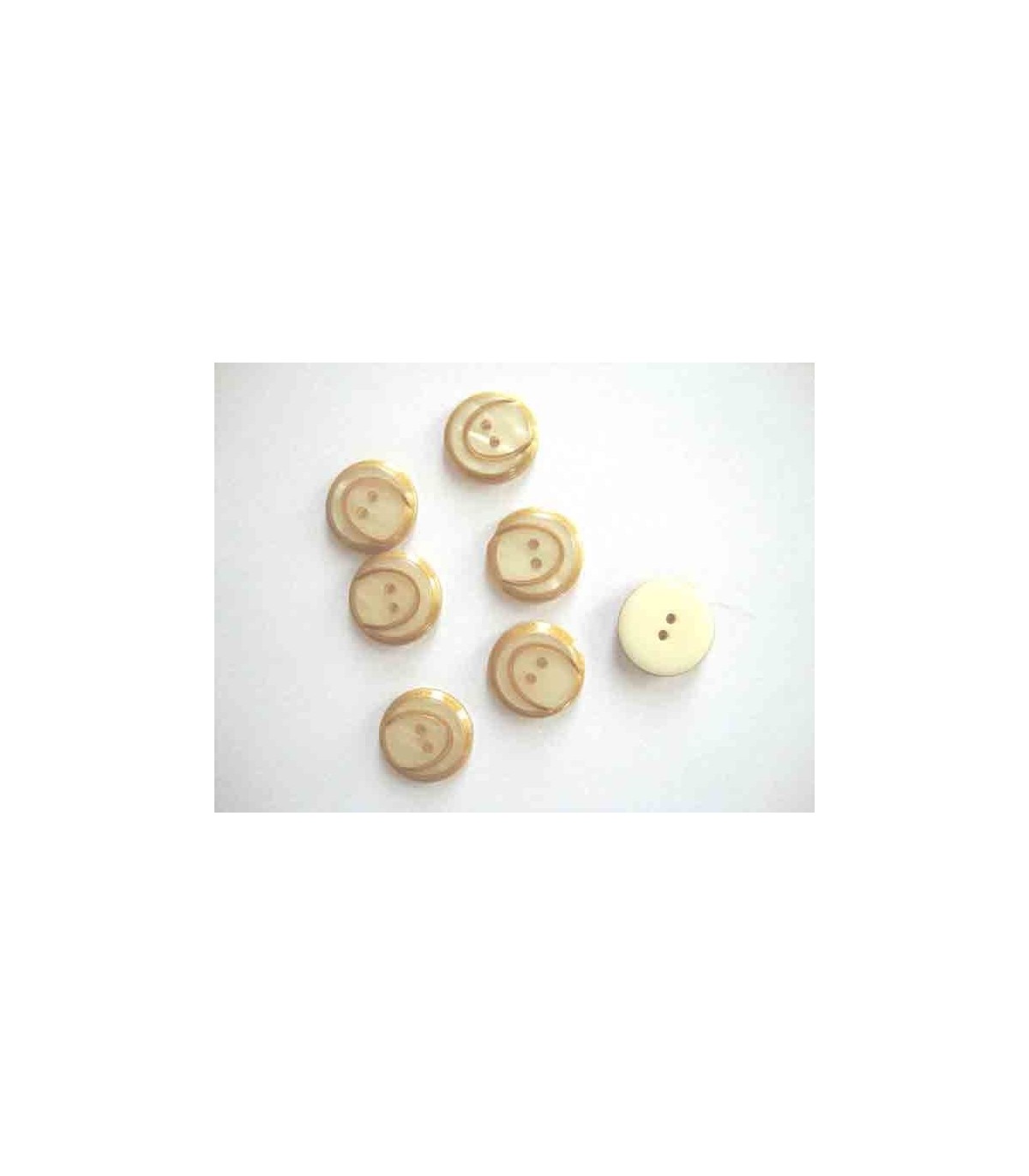 Een zandkleurige tweegaats kunststof knoop met een doorsnee van 18 mm.