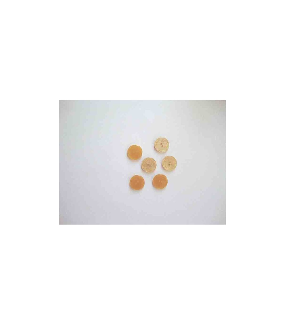 Een glanzende gemeleerde goudkleurige knoop met een doorsnee van 15 mm.