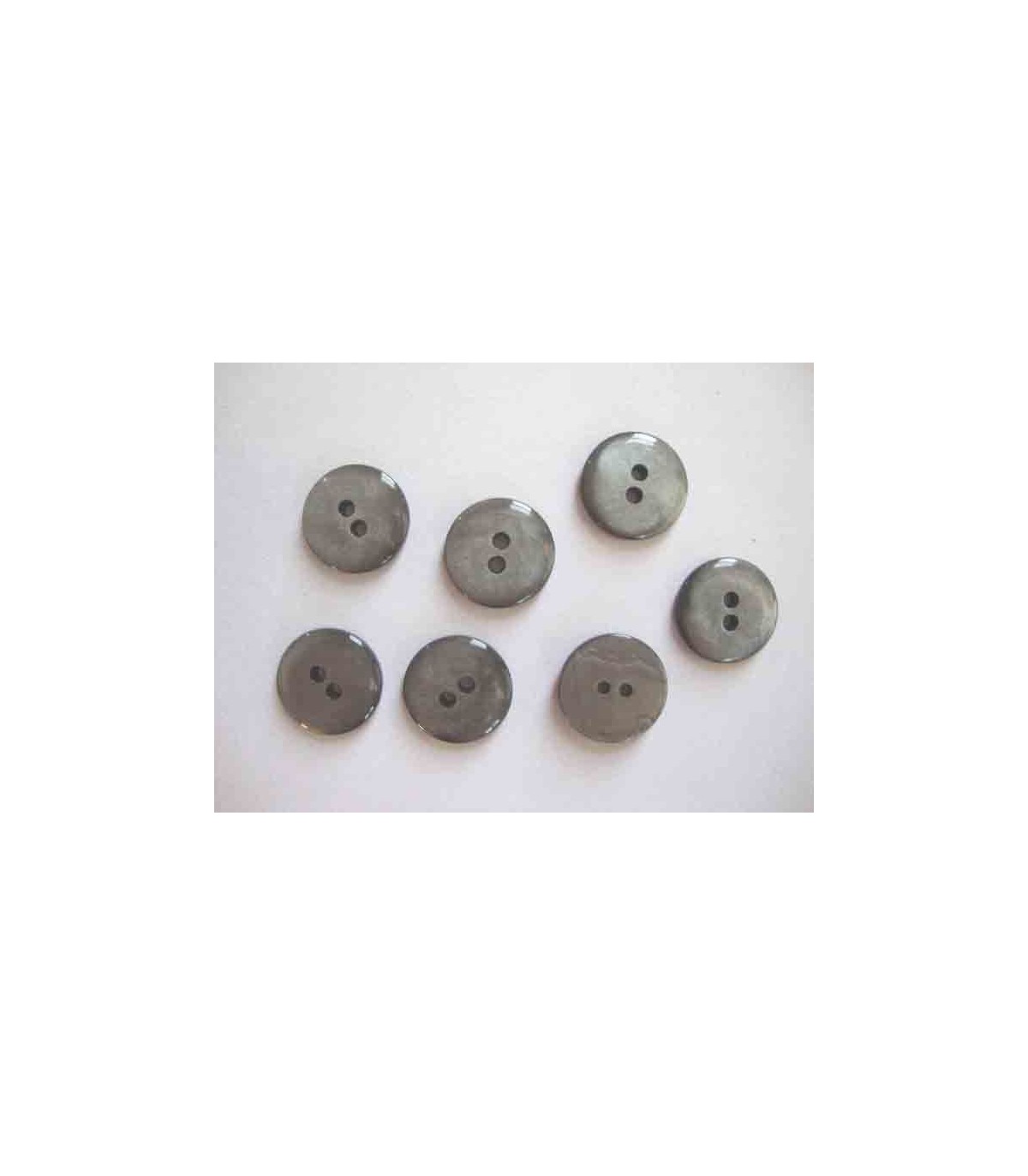 Een glanzende gladde grijze tweegaats knoop met een doorsnee van 22 mm.