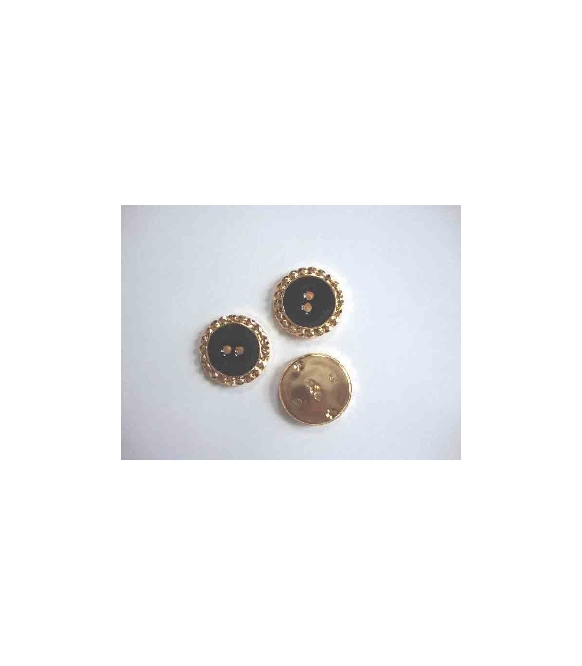 Een zwart/gouden kunststof knoop met een gouden golfrandje en een doorsnee van 25 mm,