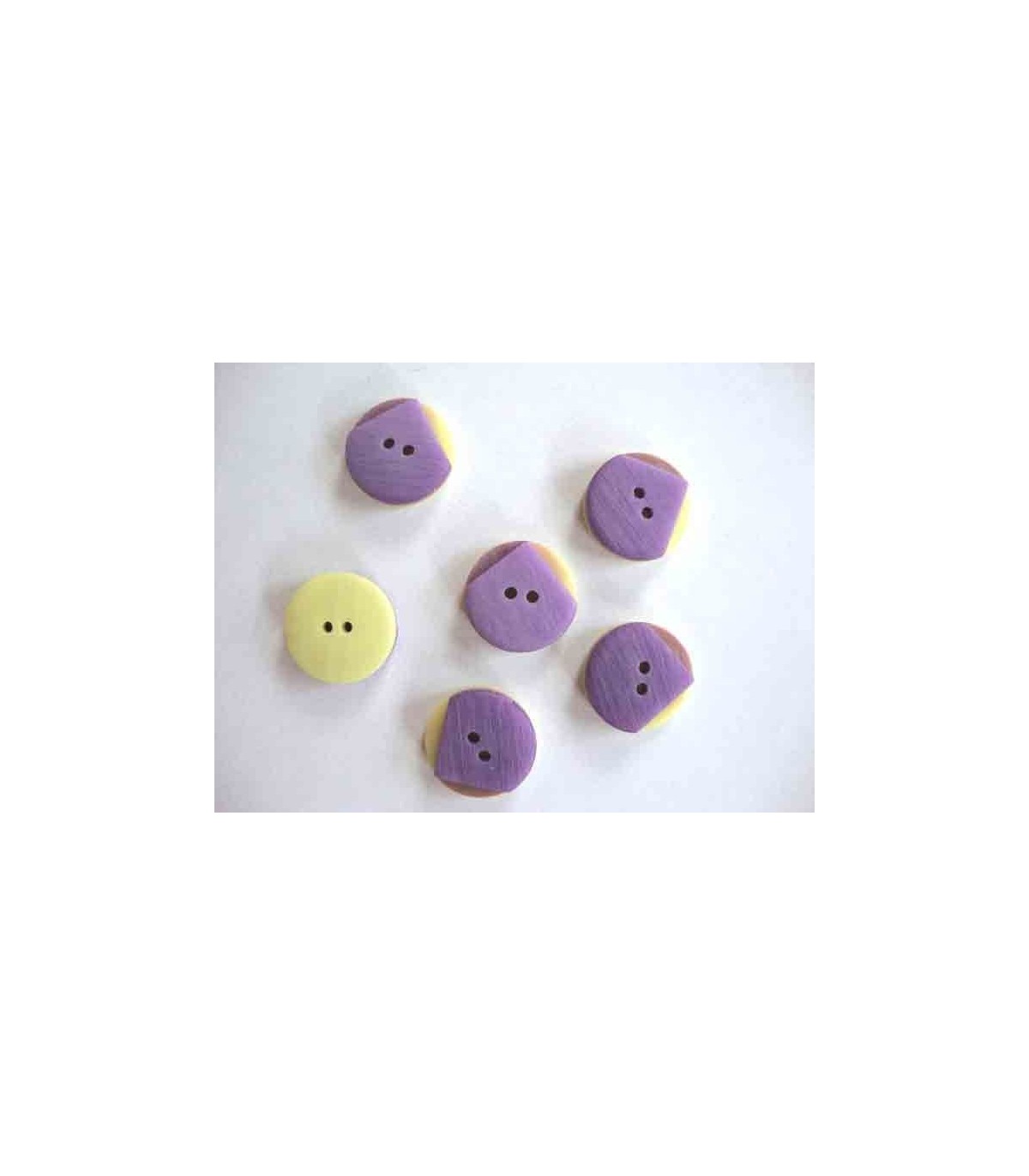 Een paars/roze/gele kunststof knoop met een doorsnee van 18 mm.