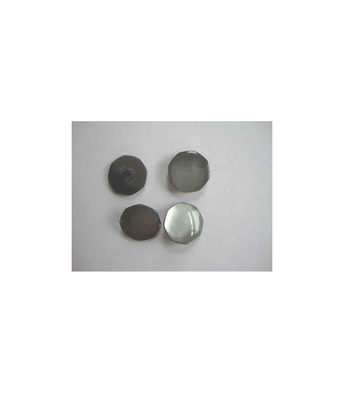 Een grijze 6 hoekige parelmoeerlook knoop met een doorsnee van 22mm.
