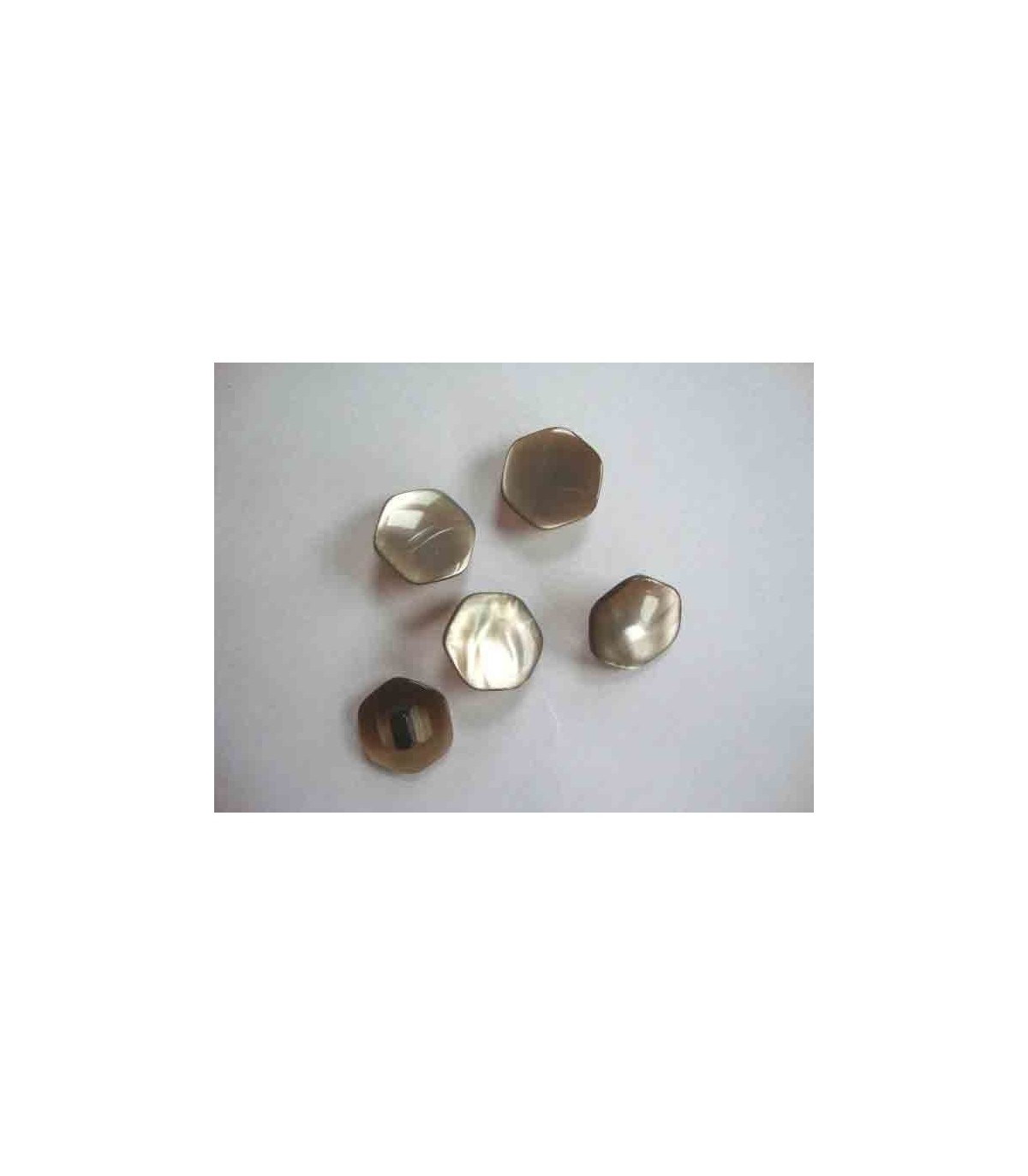 Een bruine 6 hoekige parelmoeerlook knoop met een doorsnee van 18mm.