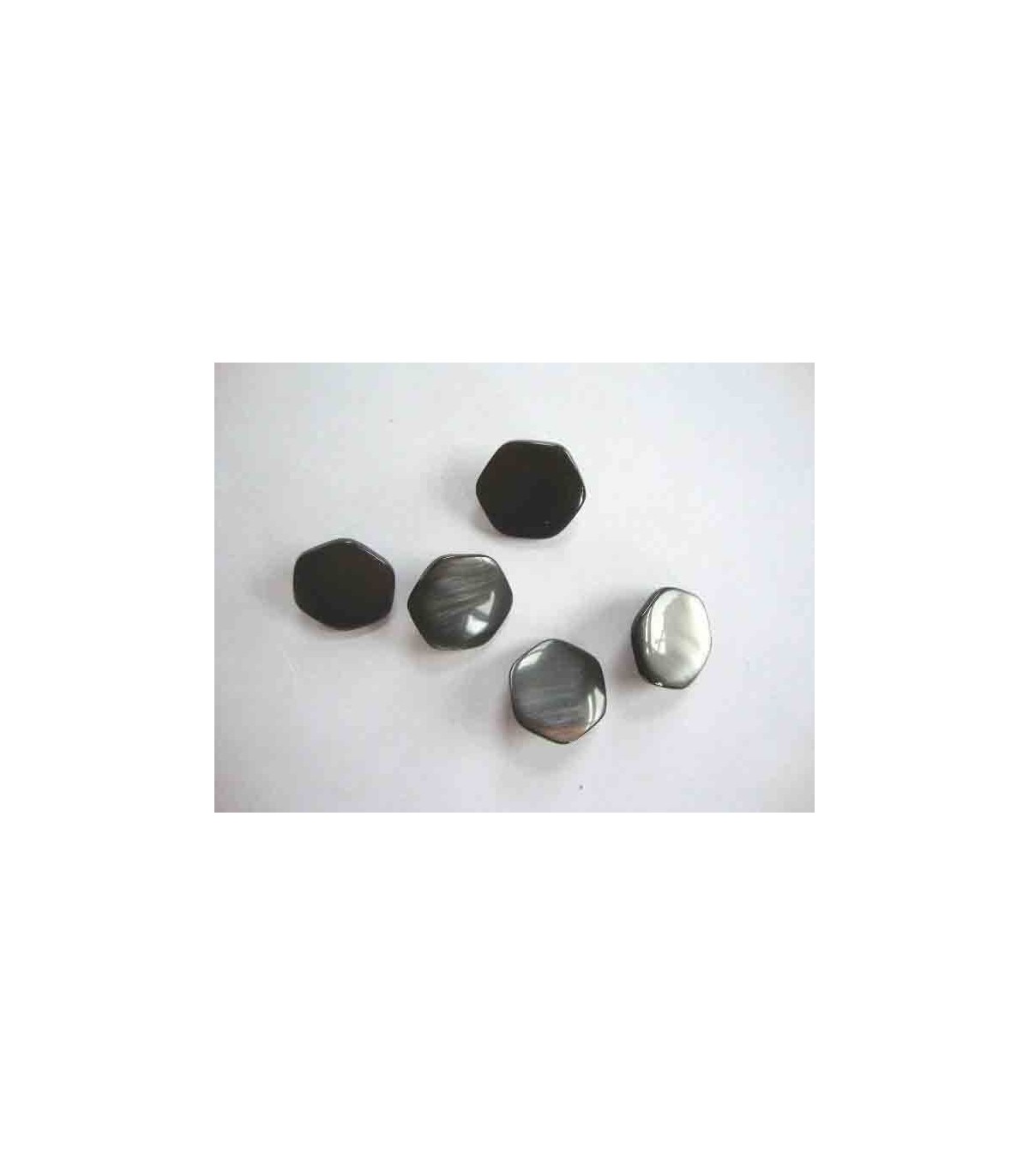 Een donkergrijze 6 hoekige parelmoerlook knoop met een doorsnee van 18mm.