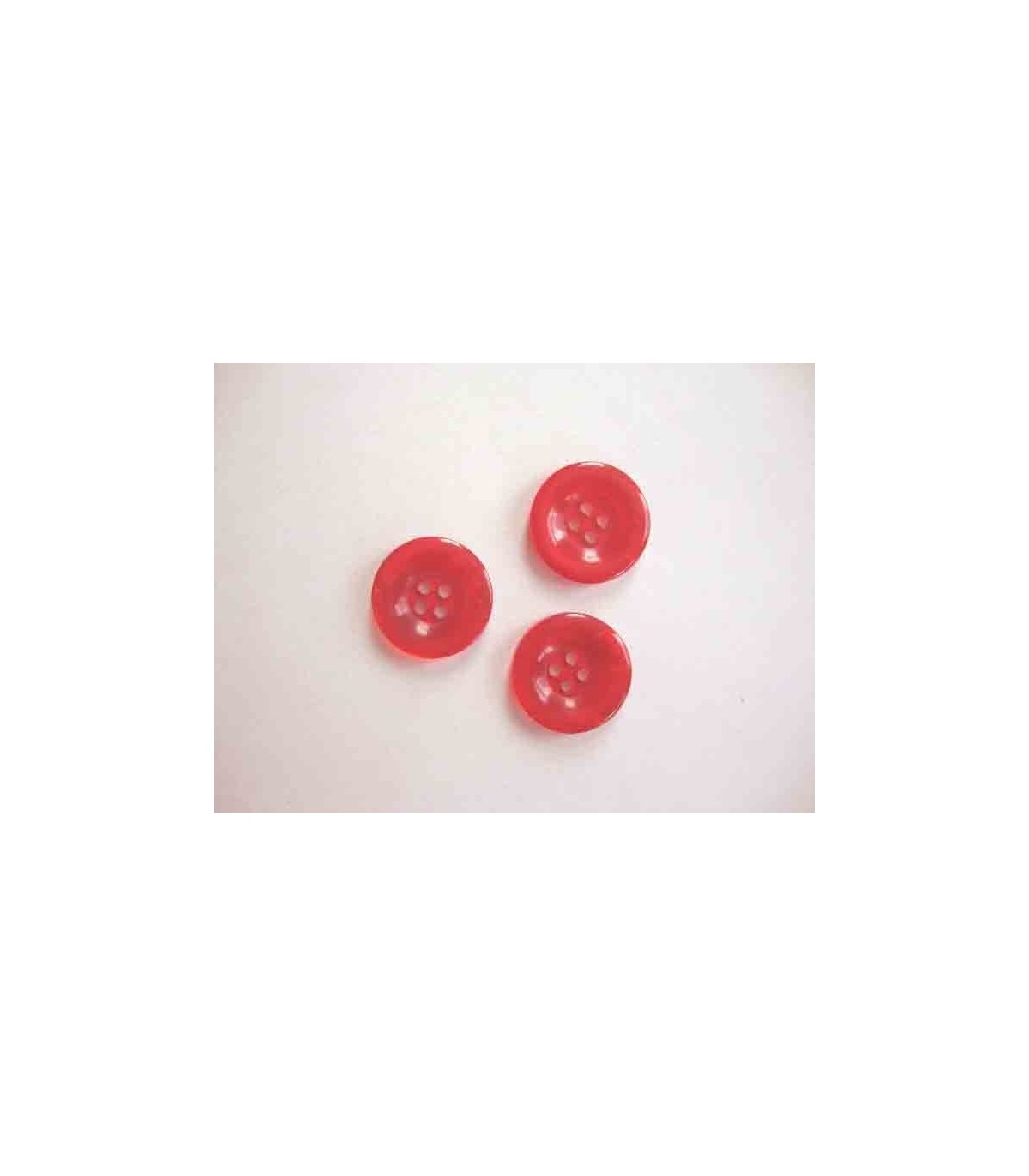 Een rode 4 gaats kunststof knoop, doorschijnend en iets gemeleerd.