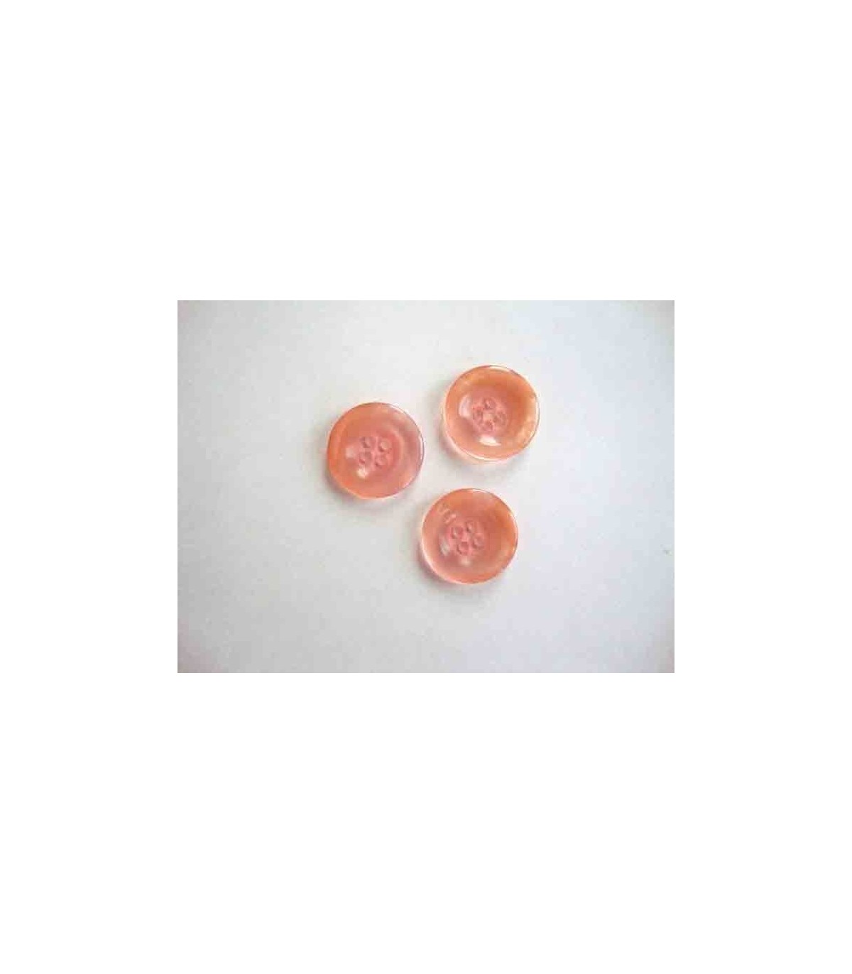 Een zalmkleurige 4 gaats kunststof knoop, doorschijnend en iets gemeleerd.