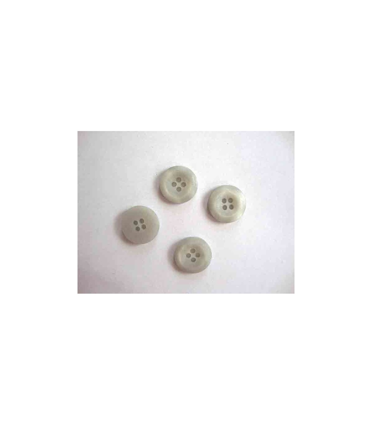 Een lichtgrijze 4-gaats kunststof knoop met een doorsnee van 15 mm.