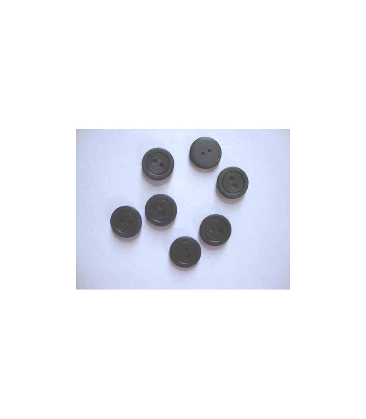 Een donker bruine 2 gaats kunststof knoop met een doorsnee van 15 mm.