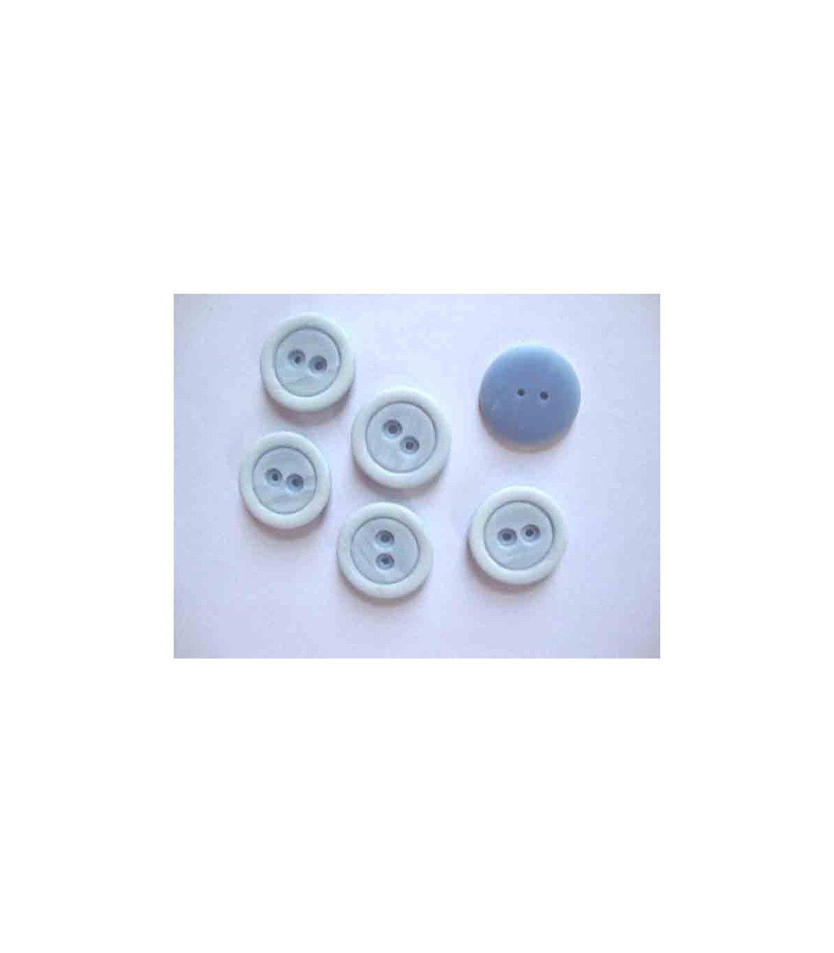Een licht blauwe 2 gaats kunststof knoop met een doorsnee van 22 mm.