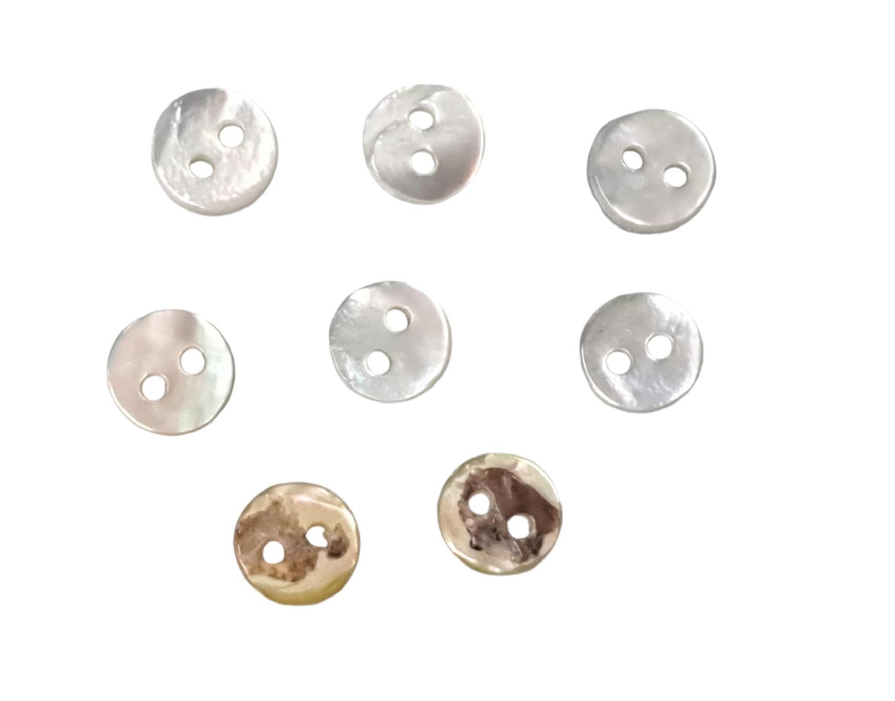 Een ronde knoop, gemaakt van parelmoer, van echte schelpen. Elke knoop is uniek.