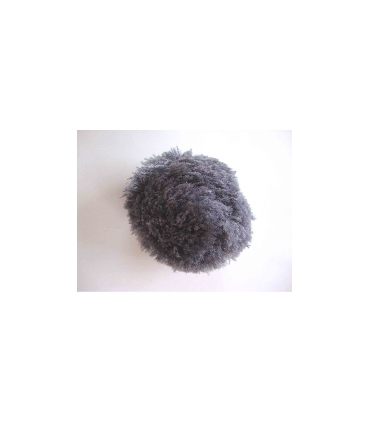 Een grijs pom pom bolletje met een doorsnee van 7 cm.