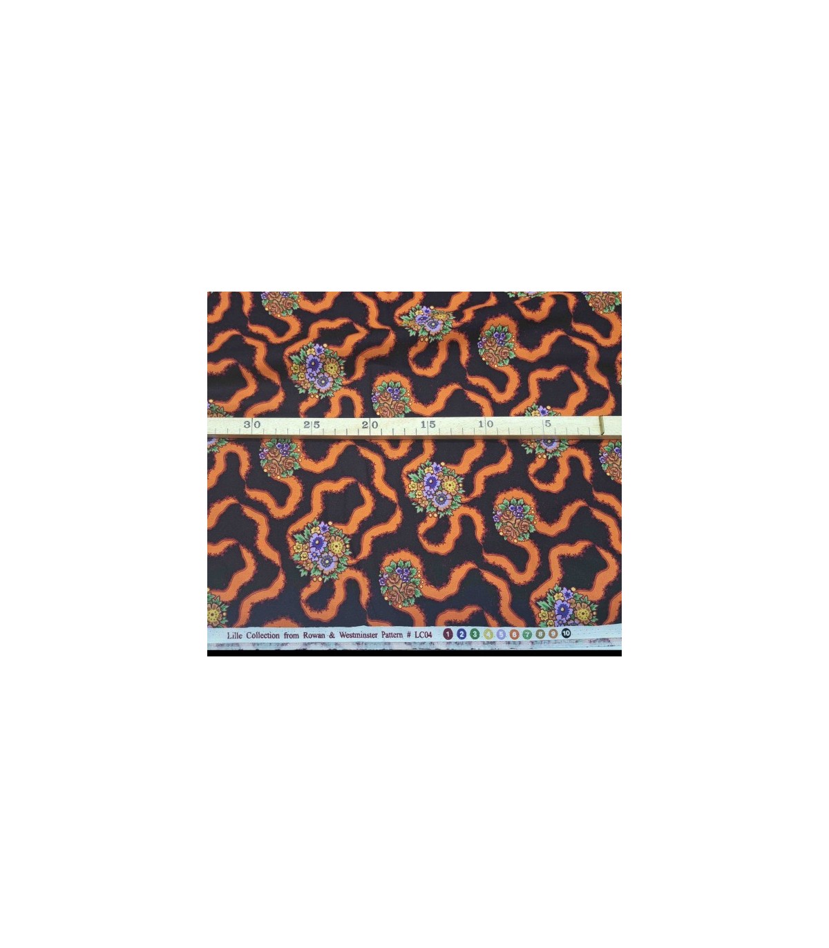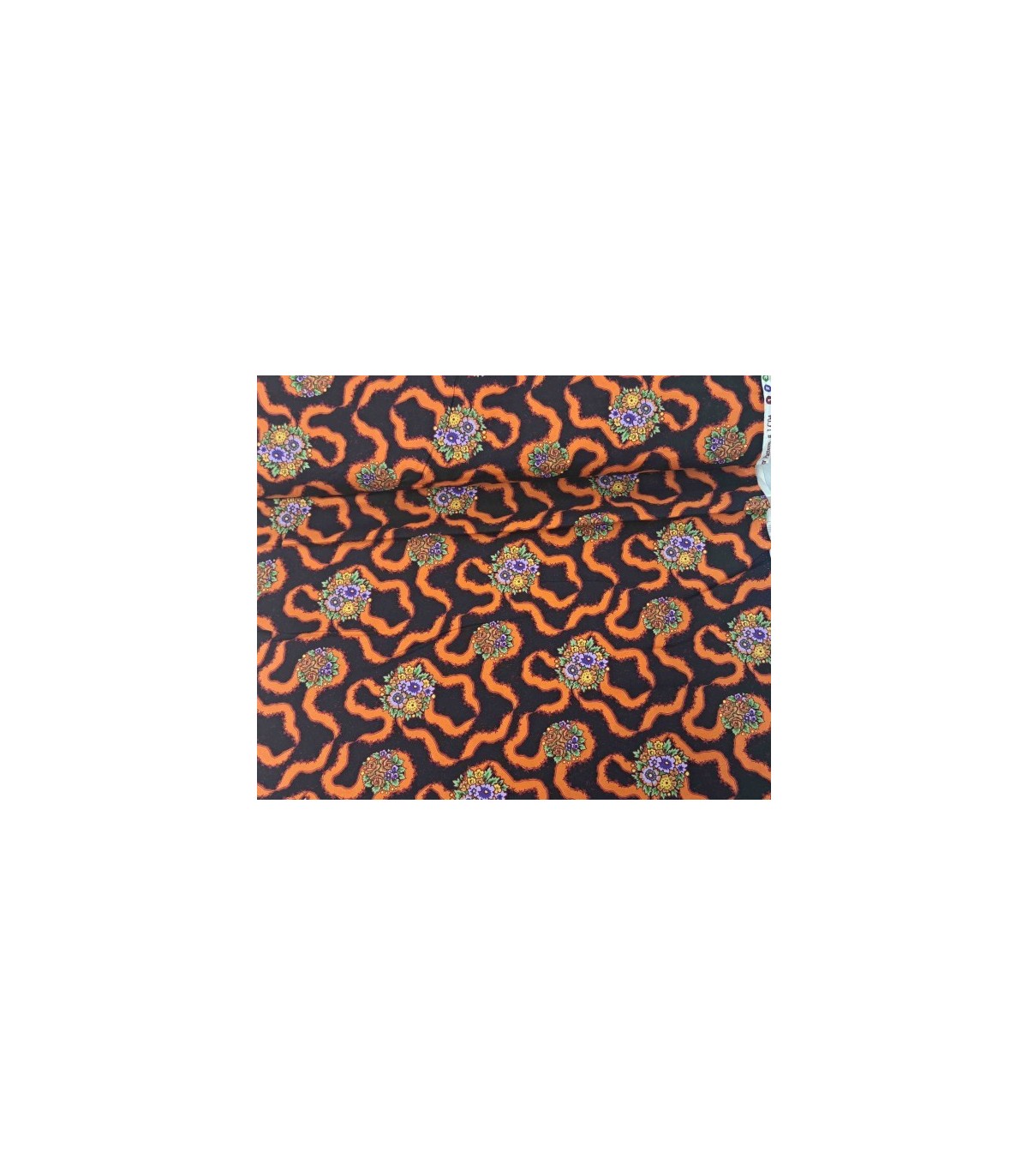 Rowan & Westminster Zwarte quiltkatoen met oranje krinkel en bloem.