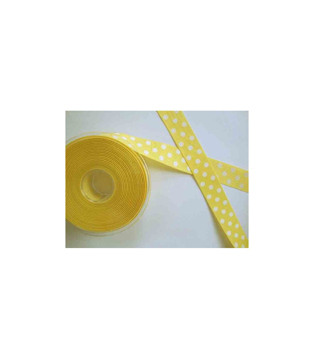 Geel ripsband met een witte stip en 25 mm. breed.