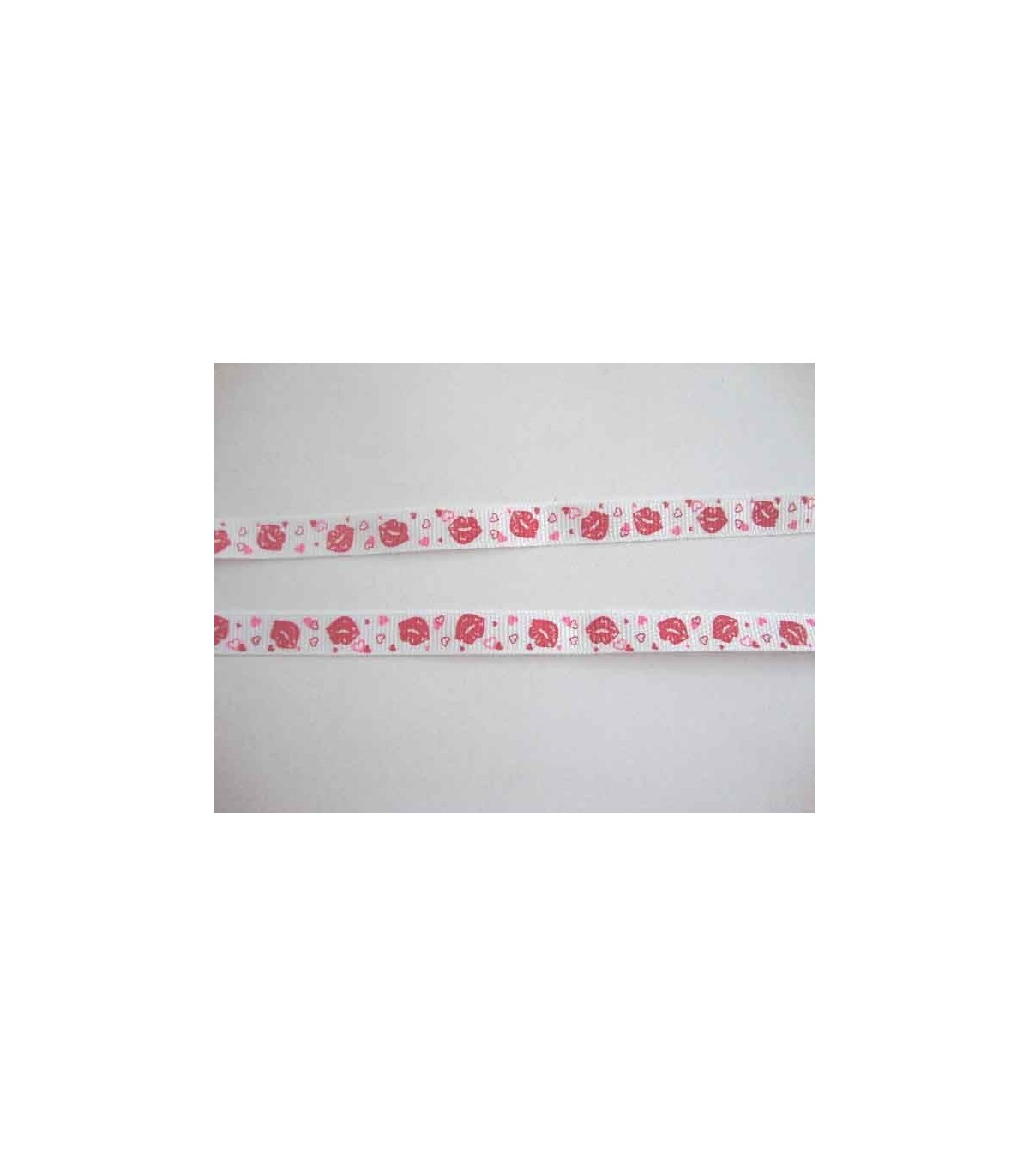 Een wit ripsbandje met rode lippen en hartjes. 10 mm. breed.