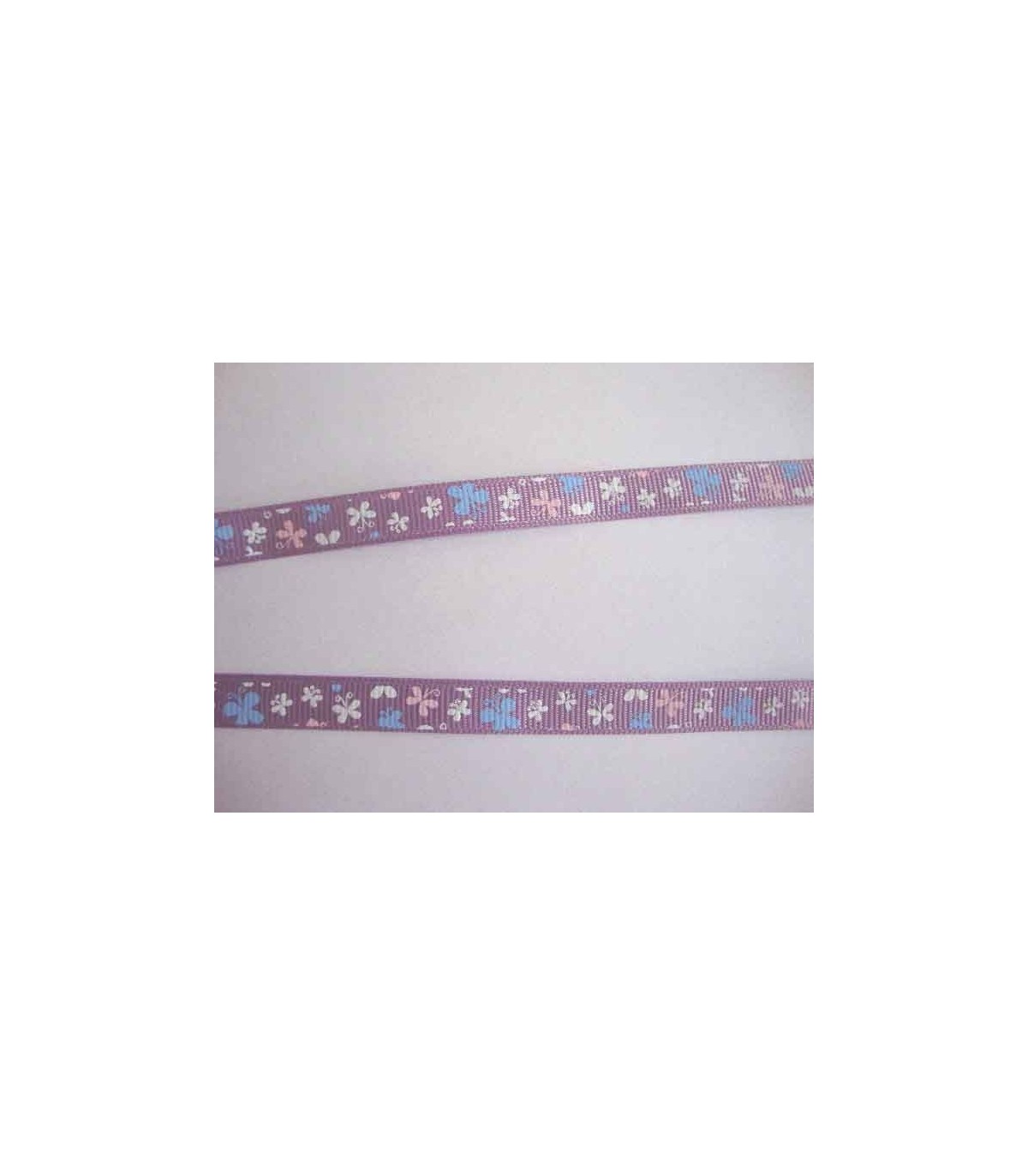 Een lila ripsbandje met roze, witte en blauwe vlinders. 10 mm. breed