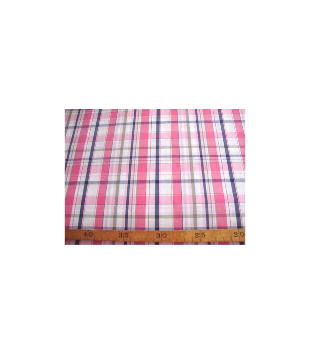 Een mooie gladde witte katoen met een roze, taupe en marine ruit.