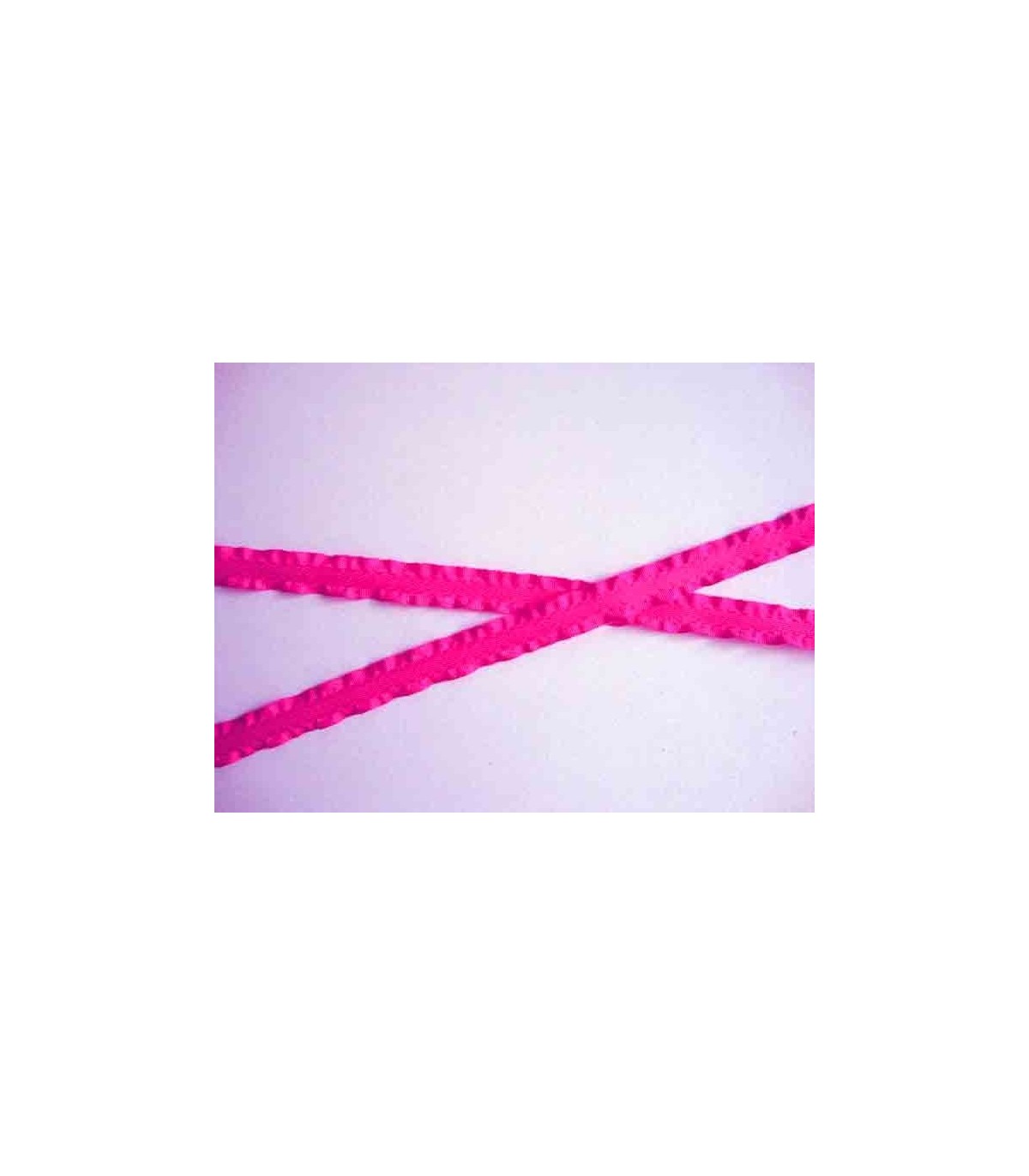 Een pinkkleurig satijnbandje met aan beide zijden een ruche