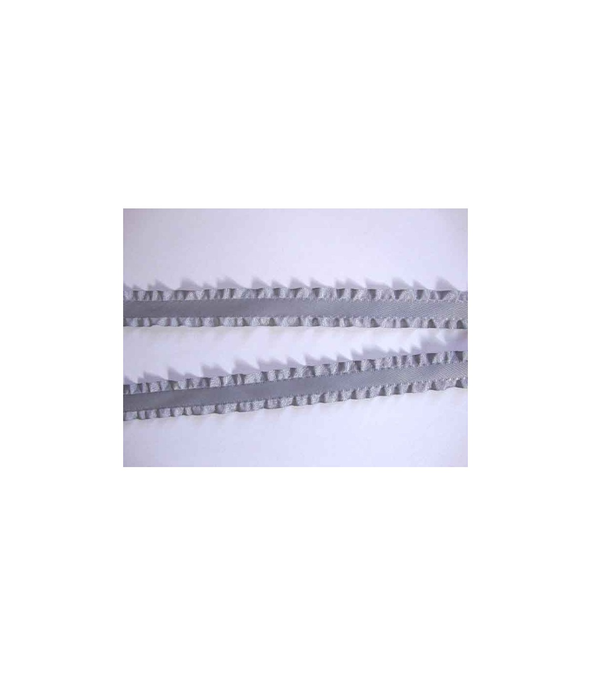 Een Grijs satijnbandje met aan beide zijden een ruche